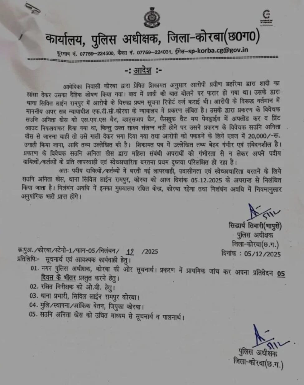 कोरबा। दुष्कर्म केस में आरोपी को बचाने, पीड़िता से 20 हजार रुपये लेने और गाली-गलौज करने के संगीन आरोपों ने कोरबा पुलिस प्रशासन को हिला दिया है। मामला महिला आयोग में पहुंचते ही पूरा सिस्टम हरकत में आया और एसपी सिद्धार्थ तिवारी ने सिविल लाइंस रामपुर थाने की उप-निरीक्षक अनिता खेस को तत्काल प्रभाव से निलंबित कर दिया। निलंबन आदेश 5 दिसंबर 2025 को जारी हुआ।