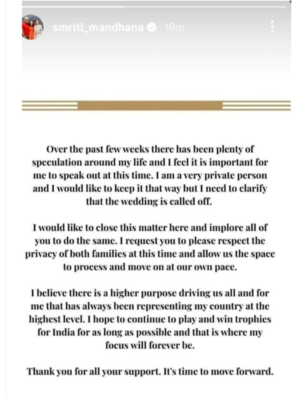 मंधाना ने लिखा, पिछले कुछ हफ्तों से मेरी निजी ज़िंदगी पर कई बातें कही जा रही हैं। मैं अपनी निजी बातें सार्वजनिक नहीं करना चाहती, लेकिन अब बताना जरूरी है कि शादी रद्द हो चुकी है। उम्मीद है कि यह मामला यहीं खत्म हो जाए, और दोनों परिवारों की प्राइवेसी का सम्मान किया जाए। अपने करियर पर फोकस करते हुए उन्होंने कहा कि उनके लिए सबसे बड़ा लक्ष्य हमेशा भारत का प्रतिनिधित्व करना है और आगे भी उनका पूरा ध्यान क्रिकेट पर रहेगा।
