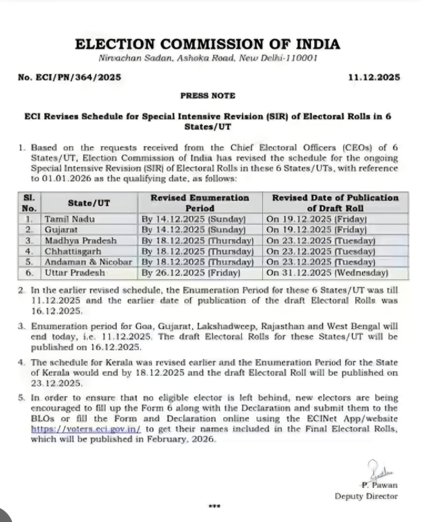 आयोग के अनुसार, तमिलनाडु और गुजरात में SIR जमा करने की नई अंतिम तिथि अब 14 दिसंबर 2025 (रविवार) होगी, जबकि इससे पहले यह 19 दिसंबर 2025 (शुक्रवार) थी.