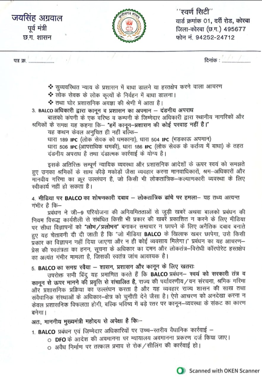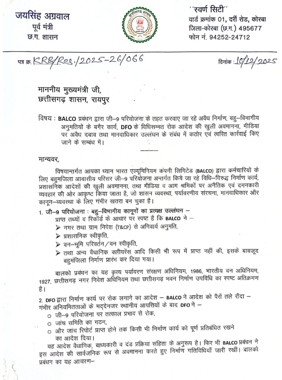 कोरबा । पूर्व मंत्री जयसिंह अग्रवाल द्वारा कलेक्टर कोरबा के माध्यम से की गई शिकायत में बालको प्रबंधन के निर्माणाधीन प्रोजेक्ट G+9 नवीन बालको टाउनशिप में व्यापक अनियमितताओं, अवैध निर्माण, पर्यावरणीय नियमों के उल्लंघन तथा विभागीय अनुमति के बिना कार्य प्रारंभ करने जैसे गंभीर आरोप शामिल हैं।