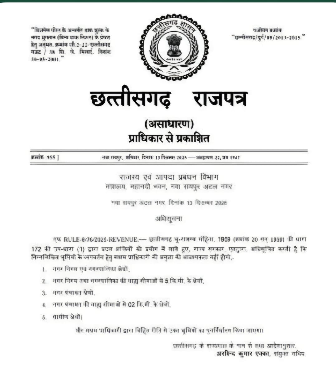 रायपुर। नए निर्णय के अनुसार, अब सक्षम प्राधिकारी निर्धारित (विहित) प्रक्रिया का पालन करते हुए सीधे भूमि का पुनर्निर्धारण कर सकेंगे। इससे भूमि उपयोग परिवर्तन की प्रक्रिया और अधिक सरल, तेज और पारदर्शी होने की उम्मीद है।