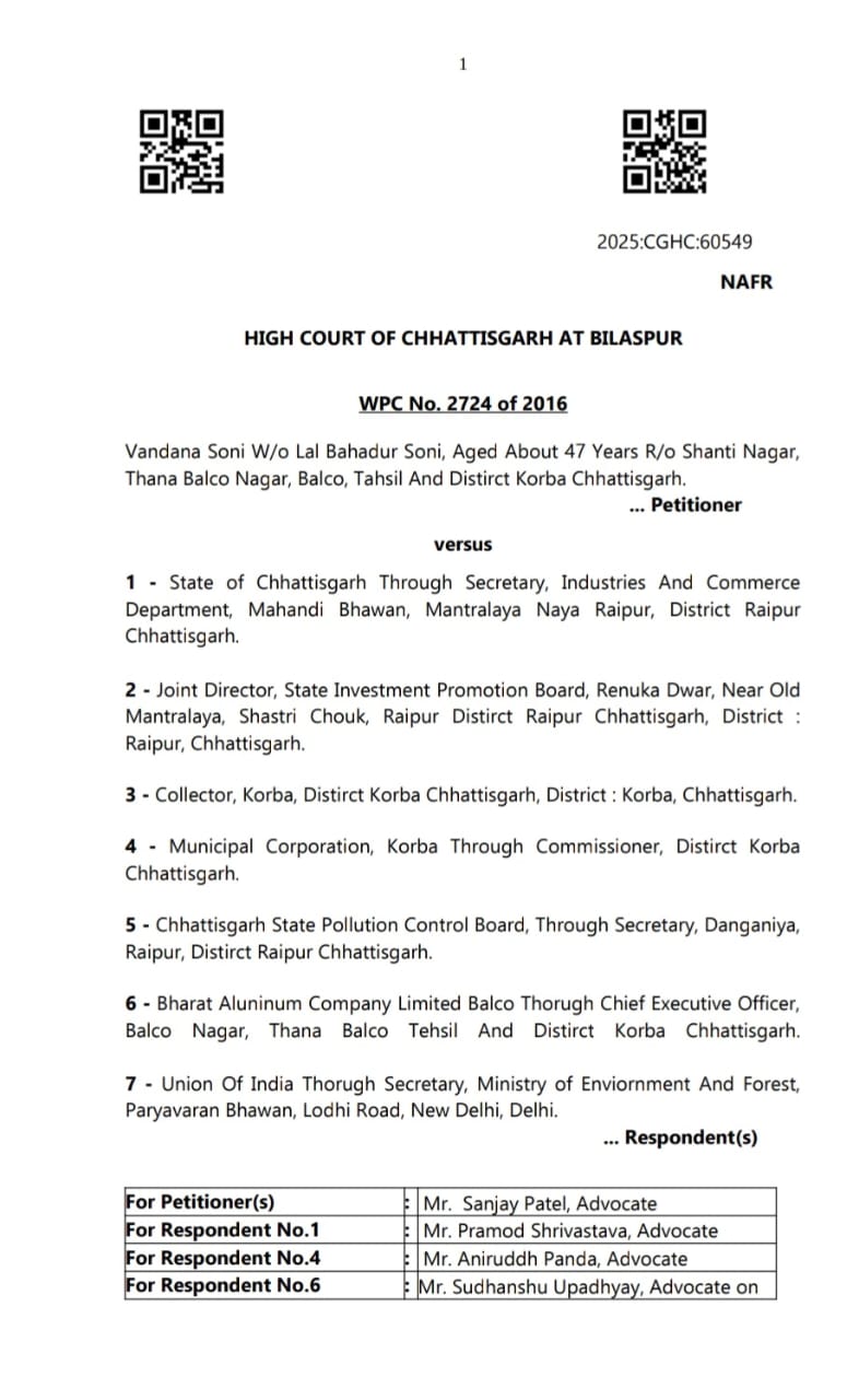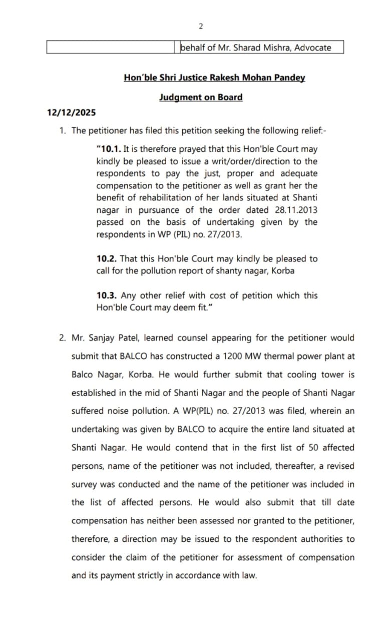 बिलासपुर/कोरबा (पब्लिक फोरम)।छत्तीसगढ़ उच्च न्यायालय ने कोरबा बालको के शांति नगर निवासियों के अधिकारों को संरक्षण देते हुए एक ऐतिहासिक और राहत भरा फैसला सुनाया है। न्यायमूर्ति श्री राकेश मोहन पांडे की एकल पीठ ने वेदांता समूह की कंपनी ‘बालको’ (BALCO) को कड़े निर्देश दिए हैं कि वह प्रभावितों की मुआवजा प्रक्रिया को तय समय सीमा के भीतर पूर्ण करे। यह आदेश शांति नगर के निवासियों के लंबे संघर्ष में एक बड़ी जीत मानी जा रही है।