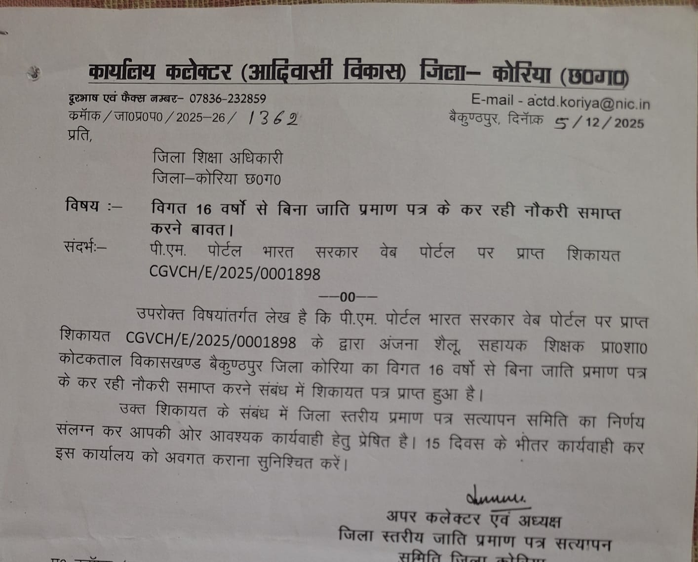 शिकायतकर्ता द्वारा जिला प्रशासन एवं शिक्षा विभाग को दिए गए आवेदन में आरोप लगाया गया था कि महिला शिक्षक ने स्वयं को अनुसूचित जनजाति का सदस्य बताते हुए नौकरी प्राप्त की, जबकि वर्ष 1950 के पूर्व बैकुण्ठपुर विकासखंड में उक्त जाति का कोई अभिलेखीय उल्लेख नहीं मिलता। इस आधार पर प्रमाण पत्र को संदिग्ध बताते हुए उच्च स्तरीय जांच की मांग की गई थी।