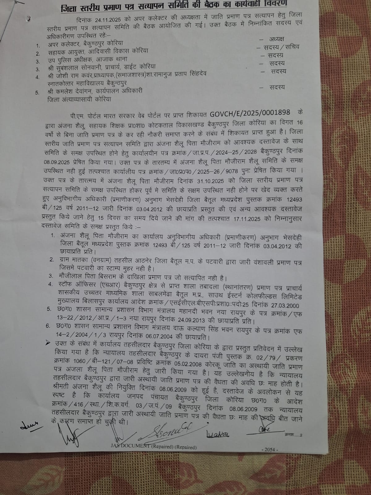 शिकायत में यह भी उल्लेख किया गया है कि महिला शिक्षक द्वारा नियुक्ति के बाद अलग-अलग समय पर अस्थायी जाति प्रमाण पत्र बैकुण्ठपुर (छत्तीसगढ़) तथा स्थायी जाति प्रमाण पत्र बैतूल (मध्यप्रदेश) से प्रस्तुत किए गए, जो पूरे मामले को और अधिक संदिग्ध बनाता है। आरोप है कि विभागीय अधिकारियों की कथित मिलीभगत से वे वर्षों से शासकीय सेवा का लाभ उठाती रहीं।