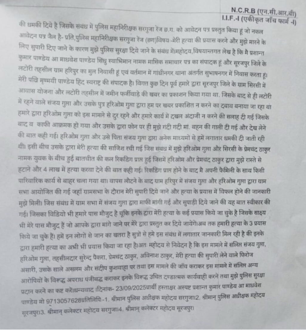 पत्रकारिता पर हमले और सत्ता–माफिया गठजोड़ का एक सनसनीखेज और लोकतंत्र को झकझोर देने वाला मामला सामने आया है। पत्रकार के हत्या की सुपारी देने के गंभीर आरोपों में लटोरी तहसीलदार सुरेंद्र साय पैंकरा, उनके करीबी भूमाफिया संजय गुप्ता, हरिओम गुप्ता, तथाकथित पत्रकार फिरोज अंसारी, उसके साले असलम सहित अन्य आरोपियों के विरुद्ध प्रतापपुर थाना में अपराध दर्ज कर लिया गया है।