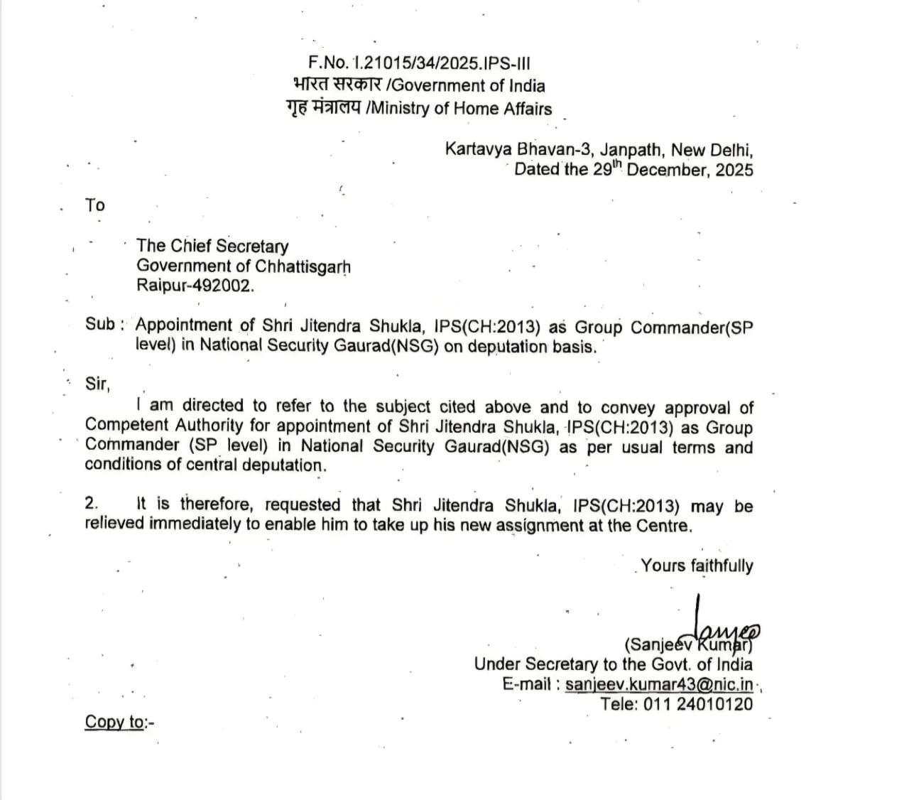 यह पत्र भारत सरकार के अवर सचिव संजीव कुमार की ओर से छत्तीसगढ़ शासन को भेजा गया है। जितेंद्र शुक्ला की NSG में तैनाती को राज्य के लिए गौरव का विषय माना जा रहा है, क्योंकि NSG देश की सबसे विशिष्ट और संवेदनशील सुरक्षा एजेंसियों में से एक है।