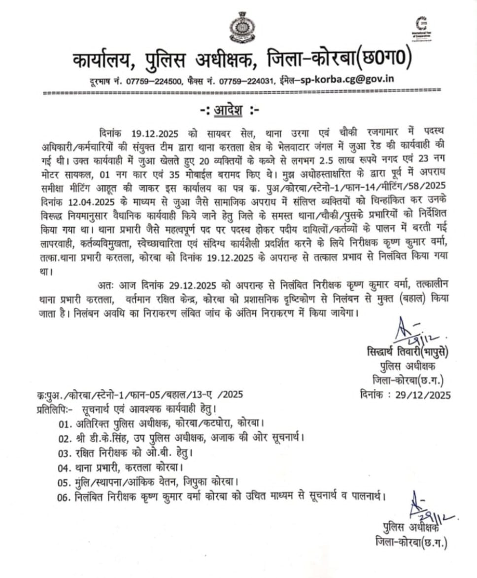 गौरतलब है कि 19 दिसंबर को सायबर सेल, उरगा थाना और रजगामार पुलिस चौकी की संयुक्त टीम ने जुआ के फड़ पर छापामार कार्रवाई की थी। पुलिस टीम ने छापा की इस कार्रवाई में 20 जुआरियों से 2.5 लाख रूपये नगद, 23 बाइक और मोबाइल फोन जब्त किये थे। पुलिस की संयुक्त टीम ने रेड की इस कार्रवाई के बाद उक्त जुआ का फड़ करतला थाना क्षेत्र के भेलवाटार के जंगल में चलने का खुलासा किया गया। जिसके बाद एसपी ने करतला थाना प्रभारी कृष्ण कुमार वर्मा का पक्ष जाने बगैर ही तत्काल एक्शन लेते हुए निलंबन की कार्रवाई कर दी थी।