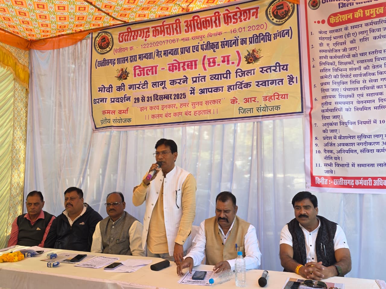 छत्तीसगढ़ कर्मचारी अधिकारी फेडरेशन जिला इकाई कोरबा के आह्वान पर जिले के कर्मचारी एवं अधिकारियों द्वारा 11 सूत्रीय मांगों को लेकर तानसेन चौक कोरबा में आयोजित आंदोलन के पहले ही दिन शासन की कर्मचारी विरोधी नीतियों के विरुद्ध शांतिपूर्ण अनुशासित एवं लोकतांत्रिक ढंग से अपना विरोध दर्ज कराया, आंदोलन में कर्मचारियों ने एकजुट होकर अपनी जायज मांगों को लेकर आवाज बुलंद की। फेडरेशन द्वारा प्रमुख रूप से निम्न मांगों पर जोर दिया गया— _केंद्रीय कर्मचारियों के समान नियत तिथि से मंगाई भत्ता प्रदान किया जाए, चार स्तरीय समय मान वेतनमान लागू किया जाए, सभी कर्मचारी एवं अधिकारियों को कैशलेस चिकित्सा सुविधा उपलब्ध कराई जाए ,अर्जित अवकाश नगदीकरण की सीमा में वृद्धि कर 300 दिन किया जाए, सेवानिवृत्ति की आयु में वृद्धि कर 65 वर्ष किया जाए, सभी विभागों की वेतन विसंगति दूर किया जावे, प्रथम नियुक्ति तिथि से सेवा गणना करते हुए सभी लाभ सहित कुल 11 सूत्रीय मांगों पर शीघ्र निर्णय लिया जाए। फेडरेशन के पदाधिकारी के. आर. डहरिया ,जगदीश खरे, डॉ . तरुण सिंह राठौर ,ओमप्रकाश बघेल, संजय शर्मा, नित्यानंद यादव द्वारा कहा गया कि कर्मचारी लंबे समय से अपनी मांगों को लेकर शासन से अपेक्षा कर रहे हैं किंतु अब तक कोई ठोस निर्णय नहीं लिया गया है इसी उपेक्षा के कारण कर्मचारियों को आंदोलन का मार्ग अपनाना पड़ा है, उन्होंने स्पष्ट किया कि यदि शासन द्वारा मांगों पर शीघ्र सकारात्मक पहल नहीं की जाती है तो यह आंदोलन आगामी दिनों में और अधिक व्यापक रूप लेगा जिसकी समस्त जिम्मेदारी शासन प्रशासन की होगी प्रथम दिवस के सफल आयोजन से कर्मचारियों में उत्साह का संचार हुआ है तथा 30 दिसंबर एवं 31 दिसंबर को भी आंदोलन को और अधिक मजबूती के साथ जारी रखने का संकल्प लिया है।फ़ेडरेशन के पदाधिकारियों द्वारा 30दिसंबर के आंदोलन मे कर्मचारी अधिकारी साथियों को सत प्रतिशत उपस्थिति हेतु अपील की गई है।