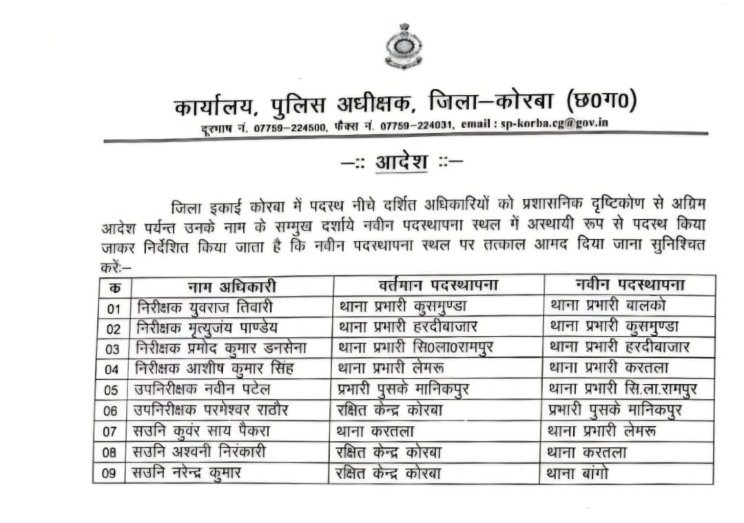 कुसमुंडा थाना प्रभारी निरीक्षक युवराज तिवारी को बालको नगर का थाना प्रभारी पदस्थ किया गया है। मृत्युंजय पांडे कुसमुंडा थाना के नए प्रभारी होंगे। आशीष कुमार सिंह को करतला थाना का प्रभारी प्रस्तुत किया गया है। प्रमोद कुमार डडसेना हरदी बाजार के नए थाना प्रभारी होंगे। इसी तरह दो एसआई और तीन एएसआई की पदस्थापना में भी फेरबदल किया गया है।