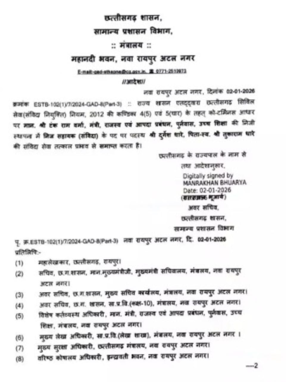 श्री दुर्गेश धारे, पिता स्व. तुकाराम धारे, निज सहायक (संविदा) के पद पर उच्च शिक्षा की निजी स्थापना में कार्यरत थे। इस संबंध में शासन की अधिसूचना में कहा गया है कि कंडिका 4(5) एवं 5(चार) के प्रावधानों के तहत यह निर्णय लिया गया है। इस निर्णय के साथ ही दुर्गेश धारे की संविदा सेवा तत्काल प्रभाव से समाप्त मानी जाएगी।