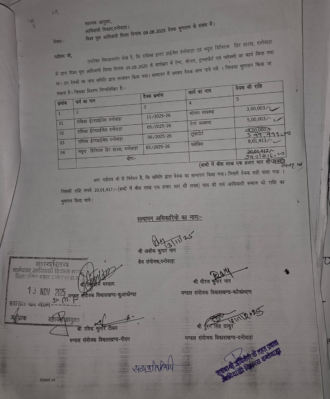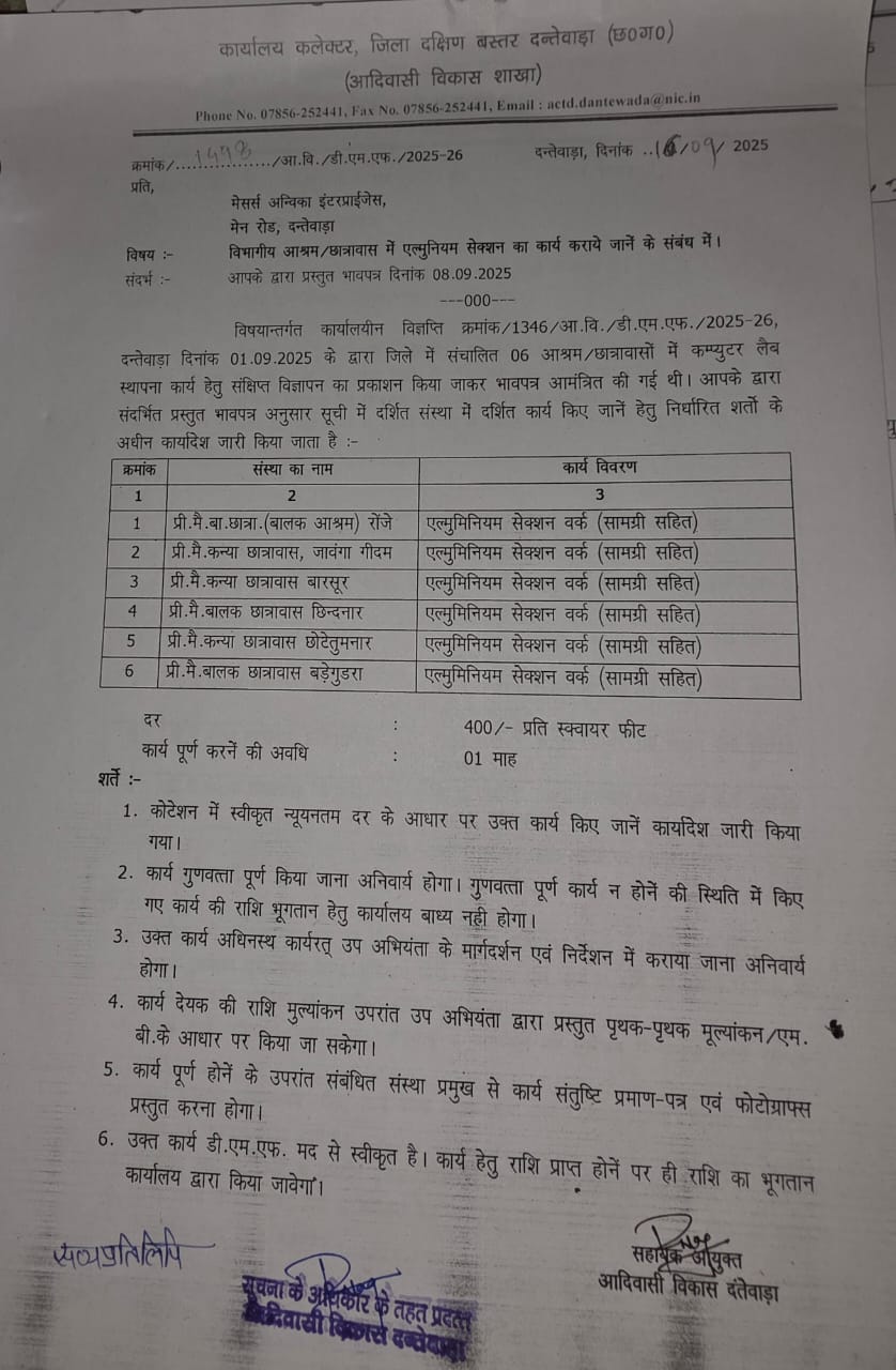 जिसके माध्यम से विस्तार से अवगत कराया गया था कि बस्तर संभाग के अंतर्गत् आने वाले आदिवासी बाहुल्य एवं नक्सल प्रभावित जिला दक्षिण बस्तर दंतेवाड़ा (छ.ग.) में कार्यालय कलेक्टर, जिला खनिज संस्थान न्यास से विभिन्न विकास कार्यों के लिए स्वीकृत राशि की बंदरबाट का जो सिलसिला अनवरत जारी है। कांग्रेस शासनकाल के दौरान डी.एम. एफ. से 5 सालों के भीतर 18 करोड़ रू. से अधिक के स्वीकृत कार्यों के लिए फर्जी टेण्डर का मामला उजागर होने के बाद जीरो टालरेंस की नीति पर कार्य कर रही सरकार ने दोषी तत्कालीन अधिकारियों एवं शाखा लिपिक के विरूद्ध एफ. आई.आर. दर्ज कराकर अगस्त माह में पुलिस के माध्यम से भ्रष्ट अधिकारियों को सलाखों के पीछे भेजा था। इस कार्यवाही को जीरो टालरेंस की नीति पर कार्य कर रही सरकार के नौकरशाहों को सख्त संदेश के रूप में देखा गया था, लेकिन यह अत्यंत दुर्भायपूर्ण है कि उक्त कड़े संदेश के बावजूद बस्तर संभाग के खनिज बाहुल्य दंतेवाड़ा जिले में आदिवासी विकास विभाग के अधिकारी पुराने ढर्रे पर ही कार्य कर डी.एम.एफ. की राशि का मनमाना उपयोग कर रहे हैं। 01 मई 2025 से कार्यालय सहायक आयुक्त, जिला- दक्षिण बस्तर दंतेवाड़ा (छ.ग.) में प्रभारी सहायक आयुक्त के रूप में मूलतः सहायक संचालक राजीव नाग को प्रभारी सहायक आयुक्त के रूप में कार्यालय आदिम जाति तथा अनुसूचित जाति विकास विभाग ने पदस्थ कर दिया है।
