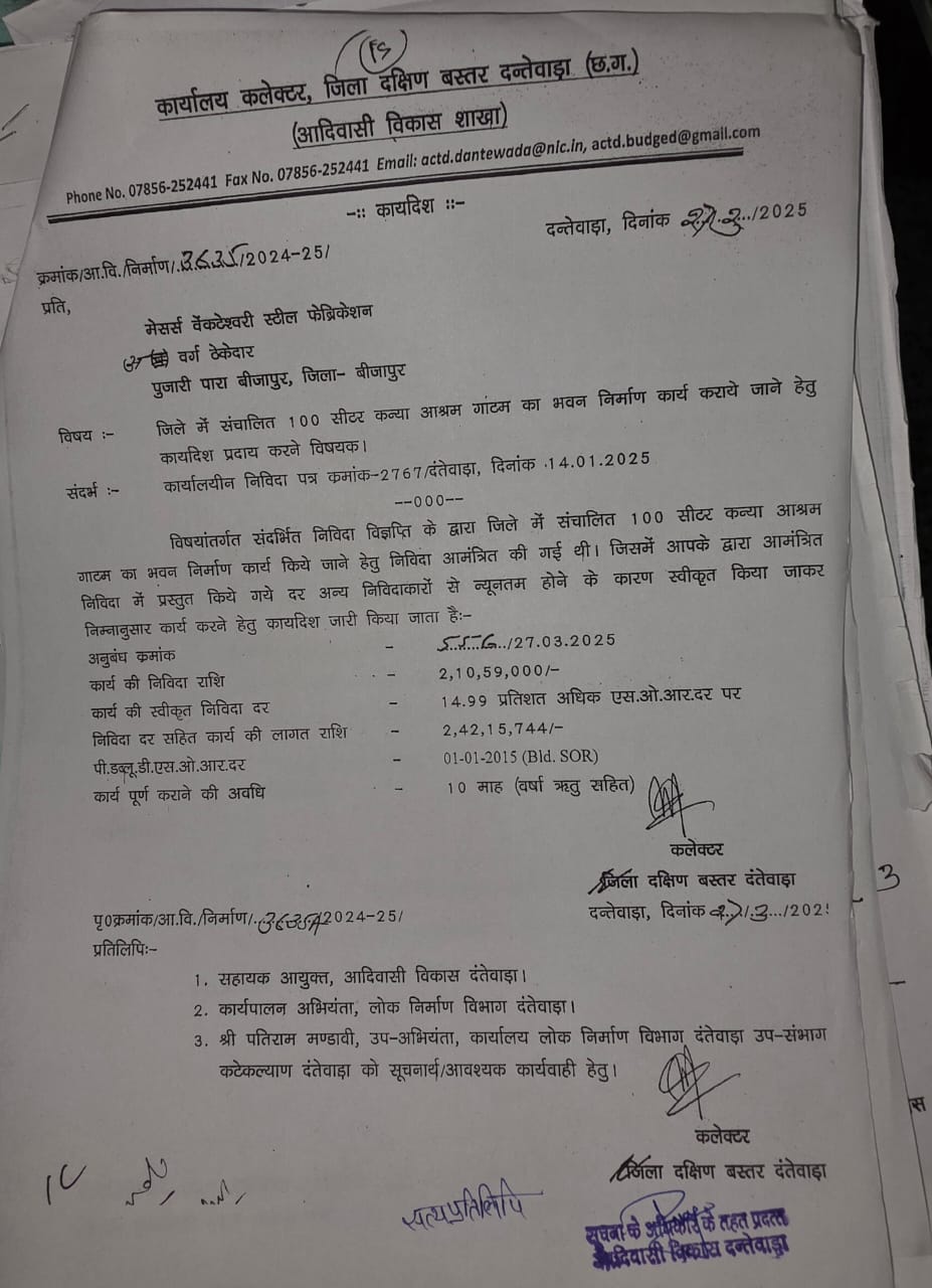 जिले में संचालित 100 सीटर कन्या आश्रम गाटम के भवन निर्माण का कार्य फर्जी टेंडर प्रक्रिया से जुड़े प्रकरण में शामिल कार्य होने की वजह से निरस्त तो कर दिया गया लेकिन सहायक आयुक्त ने फर्म के विरुद्ध आज पर्यन्त एफआईआर दर्ज नहीं कराई। उपरोक्त कार्य की कार्यादेश 27.03.2025 को तत्कालीन कलेक्टर ने दी थी। 2 करोड़ 42 लाख 15 हजार 744 रुपए की लागत से स्वीकृत यह कार्य 14.99 प्रतिशत अधिक एसओआर दर पर स्वीकृत किया गया था। जिसे वर्षा ऋतु समेत 10 माह में पूरा करना था। टेंडर फर्जीवाड़ा के मामले में जिम्मेदार अफसरों ने जरूर जेल की हवा खाई पर फर्मों पर आंच नहीं आई जिससे आज भी सवाल उठ रहे। यही नहीं विश्वस्त सूत्रों के अनुसार एकलव्य आदर्श आवासीय विद्यालय कुआकोण्डा के छात्रावास के प्रथम तल में 50 लाख से अधिक की लागत से स्तरहीन भवन निर्माण कार्य कराया गया है। बिना निरीक्षण,गुणवत्ता परीक्षण भौतिक सत्यापन किए फर्म को भुगतान कर दिया गया। स्तरहीन इस भवन में बच्चों ने रहने से इंकार कर दिया है। कुल मिलाकर जिले के समस्त आश्रम छात्रावासों में 2 साल के भीतर हुए निर्माण कार्य के उच्च स्तरीय जांच की दरकार है।