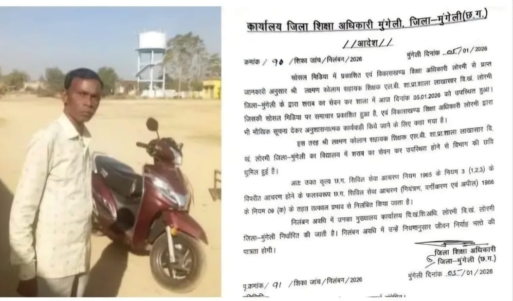जिला शिक्षा अधिकारी ने इसे छत्तीसगढ़ सिविल सेवा आचरण नियम 1965 के नियम 3 (1, 2, 3) का उल्लंघन माना। इसके तहत छत्तीसगढ़ सिविल सेवा (नियंत्रण, वर्गीकरण एवं अपील) नियम 1966 के नियम 09 (क) के अंतर्गत निलंबन की कार्रवाई की गई। निलंबन अवधि में शिक्षक का मुख्यालय विकासखंड शिक्षा अधिकारी कार्यालय, लोरमी निर्धारित किया गया है और वे नियमानुसार जीवन निर्वाह भत्ते के पात्र होंगे।