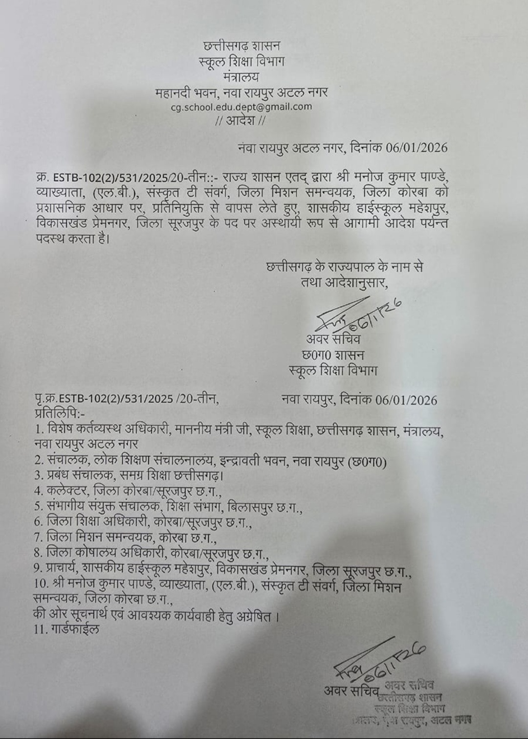 कोरबा । आकांक्षी जिला कोरबा के समग्र शिक्षा में पदस्थ मनोज कुमार पांडेय व्याख्याता (एल.बी.)सँस्कृत टी संवर्ग जिला मिशन समन्वयक के पद से हटा दिए गए हैं। अवर सचिव छत्तीसगढ़ शासन स्कूल शिक्षा विभाग ने प्रशासनिक आधार पर प्रतिनियुक्ति से वापस लेते हुए उन्हें उनके मूल पद शासकीय हाईस्कूल महेशपुर ,विकासखण्ड प्रेमनगर ,जिला -सूरजपुर के पद पर अस्थायी रूप से आगामी आदेश पर्यंत पदस्थ कर दिया है।