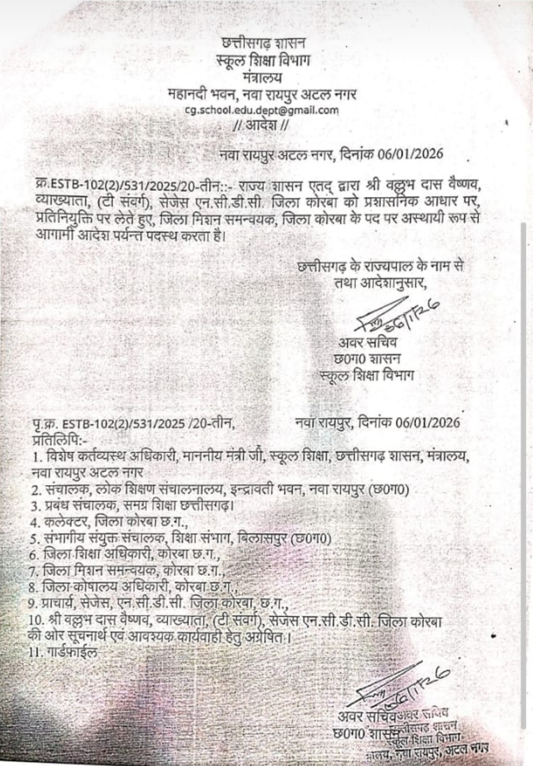 इनकी जगह राज्य शासन द्वारा वल्लुभ दास वैष्णव ,व्याख्याता (टी संवर्ग ),सेजेस ,एन.सी.डी.सी.जिला -कोरबा को प्रशासनिक आधार पर प्रतिनियुक्ति पर लेते हुए ,जिला मिशन समन्वयक ( डीएमसी ) के महत्वपूर्ण पद पर आगामी आदेश पर्यन्त पदस्थ किया गया है। डीएमएफ ,सीएसआर फंड बाहुल्य जिले में पिछले कुछ सालों से यह विभाग व अधिकारी सुर्खियों में रहे हैं। लिहाजा आगे भी इस विभाग के कामकाज ,अफसरों की कार्यशैली पर निगाहें टिकी रहेंगी।