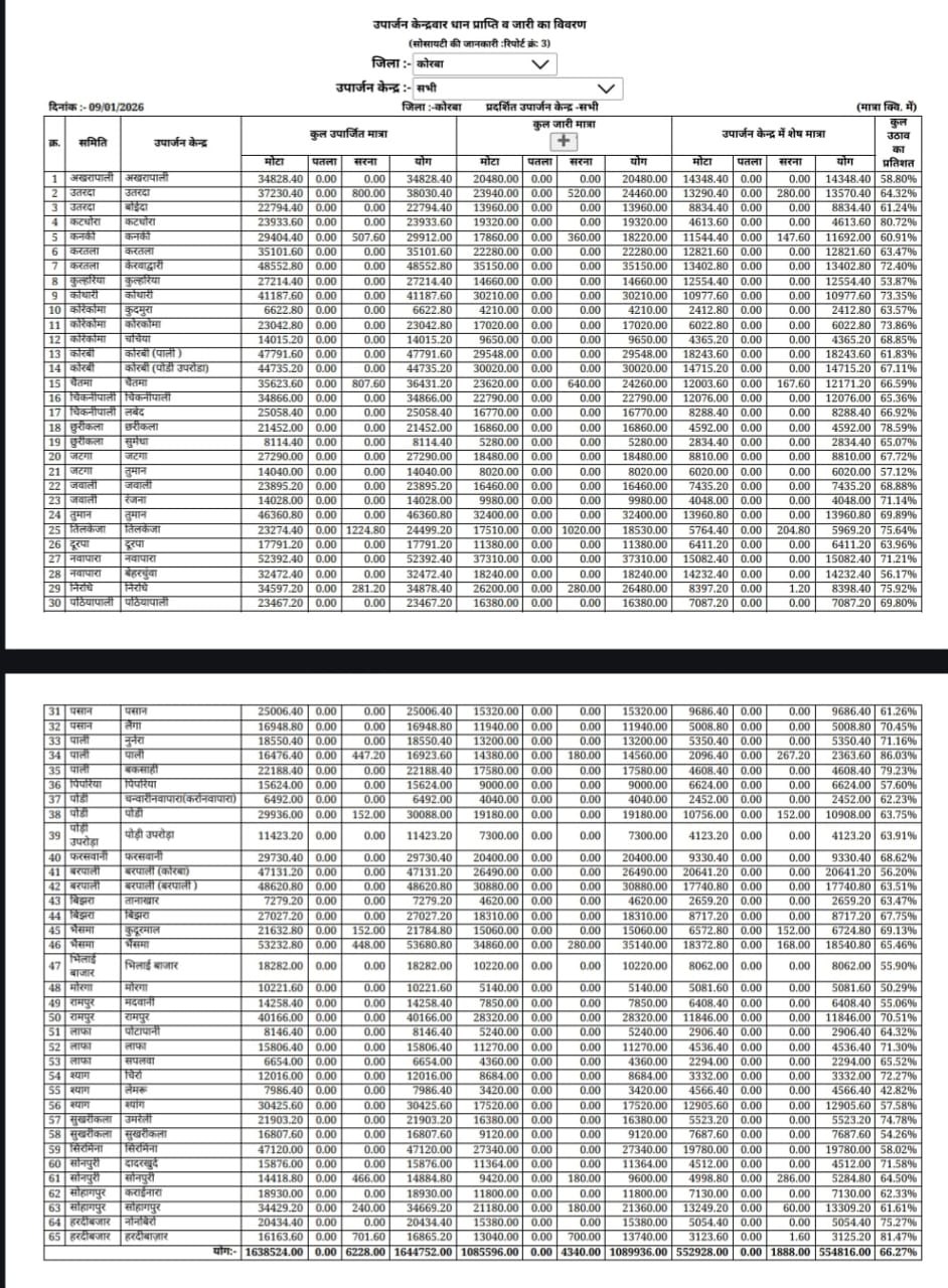 वहीं 24 उपार्जन केंद्रों में 7200 से 13 हजार क्विंटल के बीच धान उठाव का इंतजार कर रहे। इनमें उतरदा,बोईदा,कनकी, करतला ,केरवाद्वारी , कुल्हरिया , कोथारी ,चैतमा ,चिकनीपाली,लबेद,जटगा, जवाली,तुमान ,निरधि, पसान ,पोंडी,