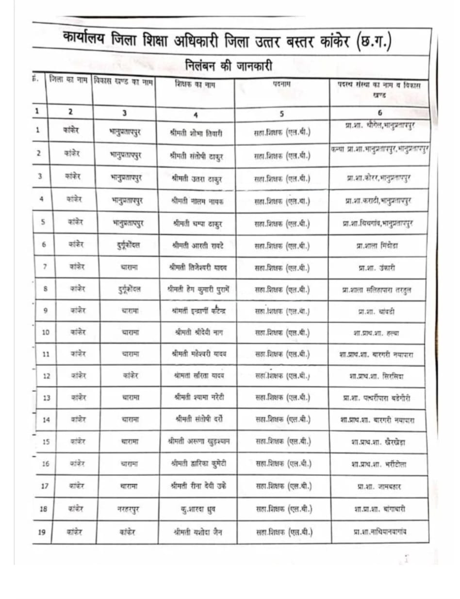 कांकेर। स्कूल शिक्षा विभाग ने बड़ी और सख्त कार्रवाई करते हुए एक साथ 38 अतिशेष शिक्षकों को निलंबित कर दिया है। हाल के दिनों में यह शिक्षा विभाग की अब तक की सबसे बड़ी अनुशासनात्मक कार्रवाई मानी जा रही है। इस फैसले के बाद जिले के शिक्षा जगत में हड़कंप मच गया है और शिक्षकों के बीच अफरा-तफरी का माहौल है।