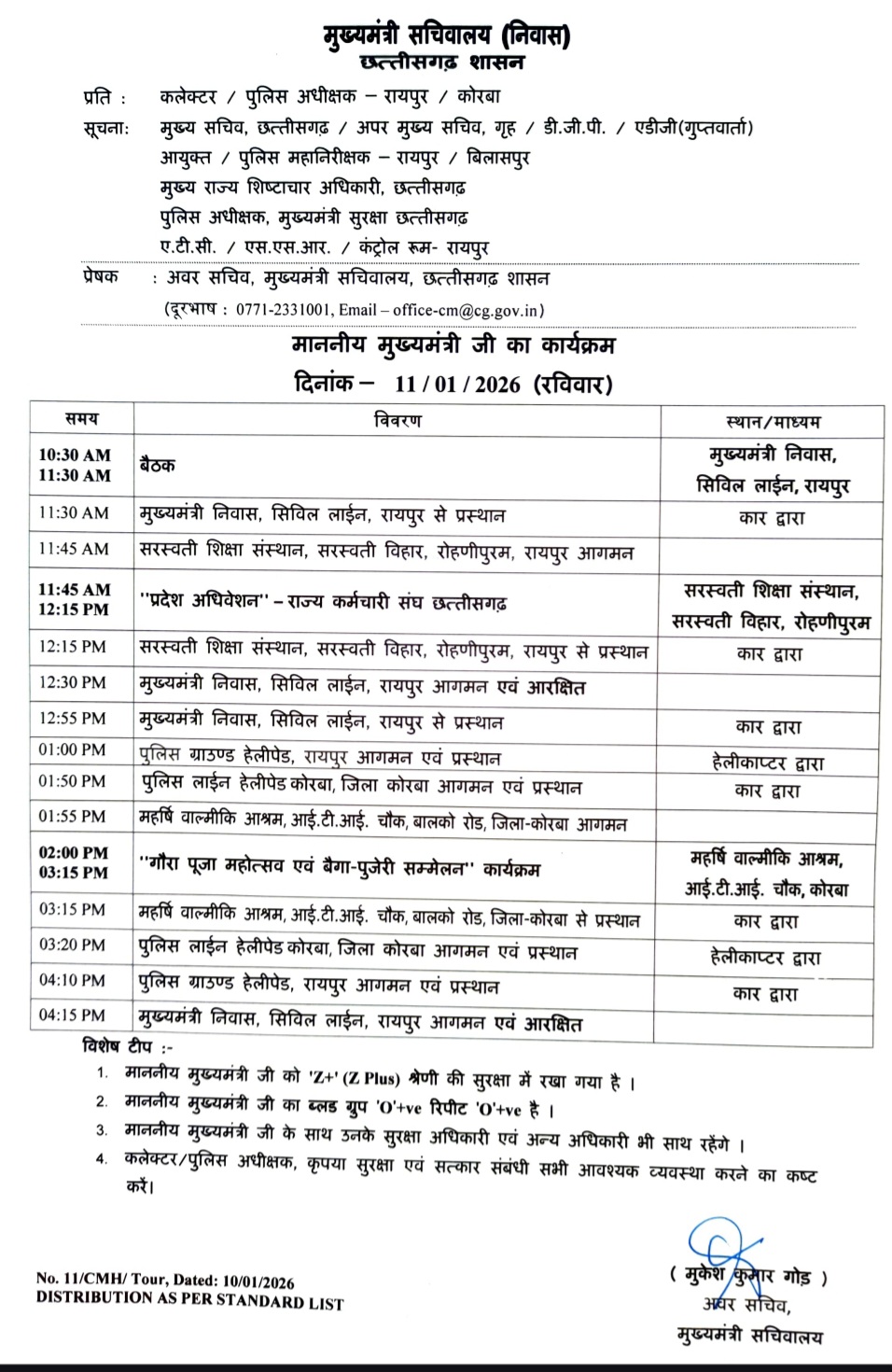 जारी प्रोटोकॉल अनुसार शासकीय हेलीकॉप्टर से मुख्यमंत्री का दोपहर 1.50 बजे पुलिस लाइन हेलीपैड में आगमन होगा। दोपहर 1.55 बजे वे कार से कार्यक्रम स्थल महर्षि वाल्मीकि अश्रम आईटीआई चौक बालको पहुँचेंगे।