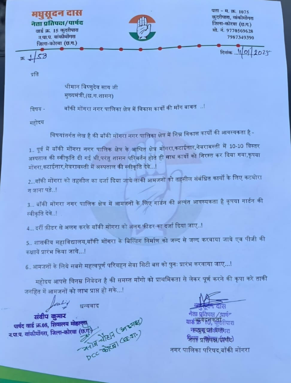 कोरबा। विपक्षी पार्षदों ने नेता प्रतिपक्ष मधुसूदन दास के नेतृत्व में बाँकी मोंगरा नगर पालिक क्षेत्र में हॉस्पिटल,गार्डन,तहसील,कॉलेज विस्तार,अलग फ़ीडर,सिटी बस प्रारंभ करने संबंधित 6 माँगो का पत्र सौपा एवं जल्द से जल्द समस्याओं के निराकरण की माँग किया।