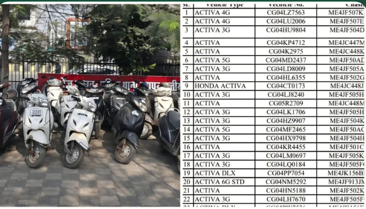 रायपुर। शहर और आसपास के थाना क्षेत्रों में सक्रिय वाहन चोरी गिरोह का पर्दाफाश हुआ है। मुख्य आरोपी रोशन रात्रे के नेतृत्व में चोरी किए गए 36 एक्टिवा वाहनों को खपाने और क्रय करने में शामिल 21 आरोपियों को एंटी क्राइम एवं साइबर यूनिट की विशेष टीम ने गिरफ्तार किया है। जप्त वाहनों की कुल कीमत लगभग 19,80,000/- रुपये आंकी गई है।