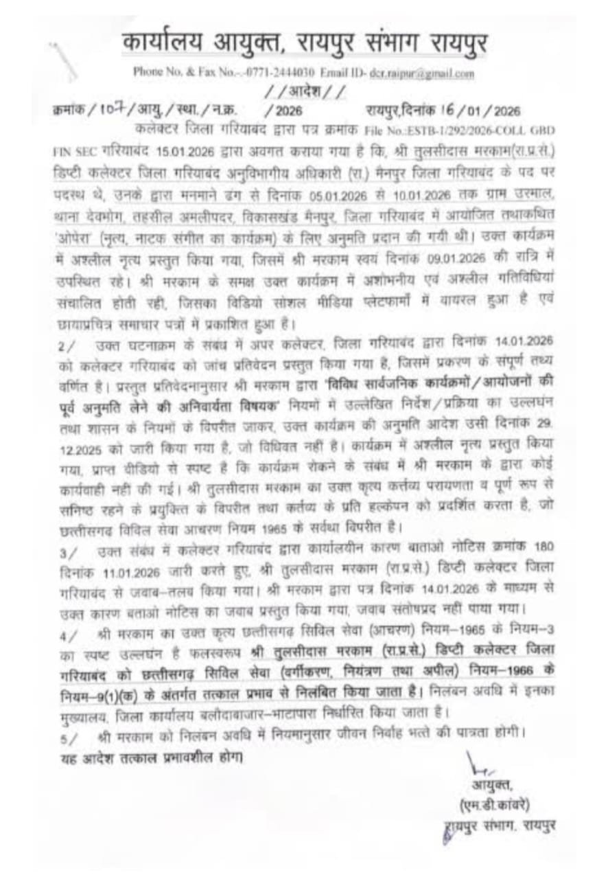 गरियाबंद जिले के मैनपुर विकासखंड के ग्राम उरमाल में 5 से 9 जनवरी 2026 तक नृत्य-नाटक-संगीत कार्यक्रम आयोजित किया गया था। इस कार्यक्रम की अनुमति तत्कालीन एसडीएम मैनपुर तुलसीदास मरकाम ने दी थी। एसडीएम को अश्लील डांस की जब जानकारी मिली तो वह पहुंचे लेकिन, अश्लील डांस रुकवाने की बजाय डांस का आनंद लेने लगे और रुपये भी लुटाए।