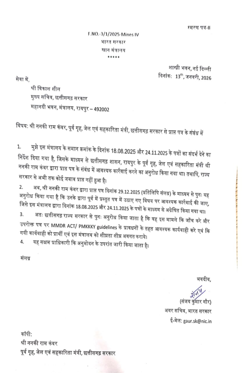 ननकी राम कंवर ने अपने पूर्व् प्रेषित पत्रों में कहा कि भारत सरकार खान मंत्रालय F.NO.-3/1/2025 – Mines IV शास्त्री भवन नई दिल्ली दि. 18 अगस्त 2025 मुख्य सचिव छत्तीसगढ़ सरकार महानदी भवन नवा रायपुर और भारत सरकार खान मंत्रालय F.NO.-3/1/2025 – Mines IV शास्त्री भवन नई दिल्ली दिनांक 24 नवंबर 2025 मुख्य सचिव छत्तीसगढ़ सरकार को जारी स्मरण पत्र जारी किया गया था। ननकी राम कंवर के द्वारा दिनांक 02/08/2025 को प्रधानमंत्री एवं कोयला एवं खान मंत्री भारत सरकार नई दिल्ली को लिखित शिकायत दिया गया था। बालको कंपनी के द्वारा निर्मित सड़क दर्री डेम से परसाभाटा बालको तक की सड़क निर्माण कार्य को बालको कंपनी को फायदा पहुंचाने के उद्देश्य से जिला खनिज संस्थान न्यास मद से स्वीकृत कर खनिज न्यास मद के राशि का दुरूपयोग कर राशि में भ्रष्टाचार करने की नीयत से स्वीकृत किया गया है। जबकि मुख्य सचिव छत्तीसगढ़ शासन को 18 अगस्त 2025 को भारत सरकार द्वारा नोटिस जारी किया गया है एवं 24 नवंबर 2025 को मुख्य सचिव छत्तीसगढ़ सरकार को पुन: नोटिस जारी हुआ है। इसके बावजूद उक्त निर्माण कार्य में रूचि लेकर कार्य को स्थानांतरण के पूर्व ही टेंडर प्रक्रिया में डलवा दिया गया। PWD, Korba Construction of Dhyanchand Chowk to Bajrang Chowk 2- Lane CC Road Length 2.84 Km Value of work: Rs. 25.98 Cr. Bid Security: Rs. 5,00,000/- Document Cost: Not mentioned Bid Start: 04-11-2025 Bid End: 25-11-2025 Tender ID: 178632 टेंडर जारी कर दिया गया है। भारत सरकार ने उपरोक्त निर्माण कार्य के संबंध में जाँच करने हेतु निर्देश दिया है। इस तरह भारत सरकार के आदेश/ निर्देश की अवहेलना जिला प्रशासन के जिम्मेदार अधिकारियों द्वारा किया जाना स्पष्ट प्रतीत हो रहा है। इस संबंध में अपेक्षा जाहिर करते हुए केंद्र सरकार के द्वारा जारी किए गए पत्रों को ध्यान में रखते हुए उपरोक्त जारी किये गए टेंडर तत्काल निरस्त करने हेतु निर्देश देते हुए उपरोक्त सड़क को बालको कंपनी के राशि से निर्मित कराया जावे ना कि जिला खनिज संस्थान न्यास मद से। उपरोक्त संदर्भित आदेश के बावजूद टेंडर जारी कराने में रूचि रखने वाले अधिकारियो के विरुद्ध तत्काल कार्यवाही करने के संबंध में पत्र लिखा गया है। पत्र पर अवर सचिव भारत सरकार खान मंत्रालय के द्वारा 13 जनवरी 2026 को श्री विकासशील मुख्य सचिव छत्तीसगढ़ सरकार महानदी भवन मंत्रालय रायपुर को पुन: अनुरोध किया गया है कि एमएमडीआर एक्ट PMKKKY गाइडलाइंस के प्रधानों के तहत आवश्यक कार्रवाई करें एवं की गई कार्यवाही से प्रार्थी एवं इस मंत्रालय को शीघ्रता शीघ्र अवगत कराये। अब देखना होगा कि राज्य सरकार टेंडर की प्रक्रिया निरस्त करती है या केंद्र सरकार के पत्रों की अवहेलना करती है।