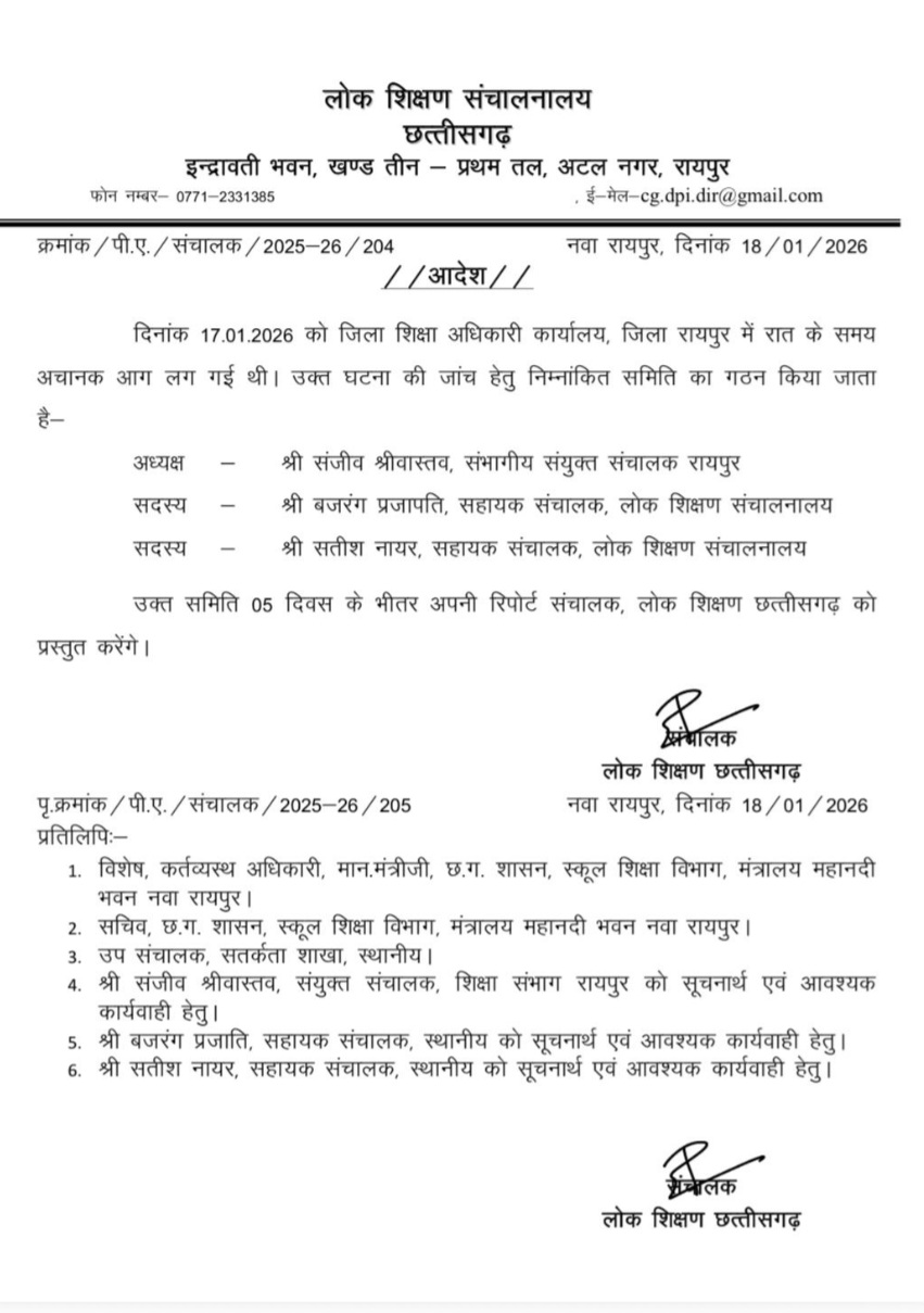 रायपुर । शनिवार को राजधानी रायपुर स्थित जिला शिक्षा अधिकारी कार्यालय में हुई भीषण आगजनी से कई महतवपूर्ण दस्तावेज जलकर खाक हो गए हैं। आगजनी की सन्देहास्पद घटना को लेकर सोशल मीडिया में कई तरह की चर्चाएं वायरल हो रही। इन सब स्थिति को देखते हुए संचालनालय लोक शिक्षण संचालनालय (DPI ) द्वारा 3 सदस्ययीय जांच समिति गठित कर 15 दिवस (पखवाड़े)भर के भीतर जांच प्रतिवेदन मांगा गया है।