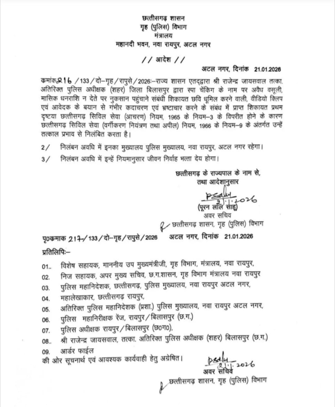 रायपुर । स्पा सेंटर संचालक से अवैध वसूली और धमकाने के मामले में एएसपी राजेंद्र जायसवाल पर गाज गिर गई है। राज्य सरकार ने उन्हें सस्पेंड कर दिया है। इस फैसले की पुष्टि आज सुबह गृहमंत्री विजय शर्मा ने की थी।