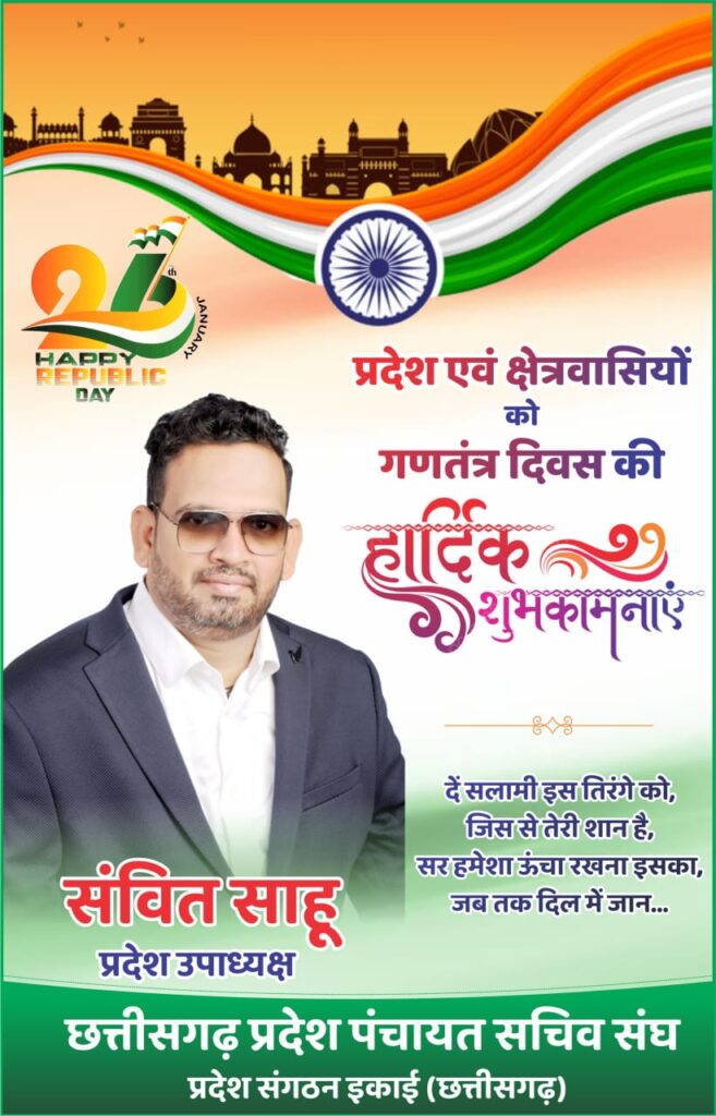 हसदेव एक्सप्रेस न्यूज कोरबा। छत्तीसगढ़ प्रदेश पंचायत सचिव संघ प्रदेश संगठन इकाई (छत्तीसगढ़ ) के प्रदेश उपाध्यक्ष संवित साहू एवं ब्लॉक सचिव करतला परमानन्द राजवाड़े ने समस्त प्रदेशवासियों एवं क्षेत्रवासियों को 77वें गणतंत्र दिवस की हार्दिक शुभकामनाएं दी है।