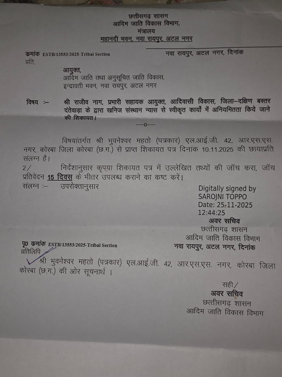 मितव्ययिता के अभाव ,अनियमितता की यह पहली शिकायत नहीं है ,इससे पूर्व भी बस्तर संभाग में आदिवासी विकास विभाग घोटालों में सुर्खियों में रहा है। दंतेवाड़ा में 18 करोड़ के फर्जी टेंडर मामले में 2 पूर्व सहायक आयुक्तों,लिपिकों को जेल तक की हवा खानी पड़ी थी। हाल ही में प्रभारी सहायक आयुक्त राजीव नाग के कार्यकाल में चालू वित्तीय वर्ष 2025 -26 में जिला खनिज न्यास से स्वीकृत 15 करोड़ रुपए से अधिक के कार्यों में अनियमितता की प्रमुख सचिव आदिम जाति विकास विभाग से लिखित शिकायत कर सहायक आयुक्त को तत्काल हटाए जाने की अनुरोध की गई थी। जिसमें अवर सचिव आदिम जाति विकास विभाग ने 25 नवंबर 2025 को आयुक्त आदिम जाति तथा अनुसूचित जाति विकास इंद्रावती भवन ,नवा रायपुर को पत्र लिखकर प्रकरण की उल्लेखित तथ्यों के आधार पर 15 दिवस के भीतर जांच कराकर प्रतिवेदन मांगा था। लेकिन अकर्मण्य आयुक्त आदिम जाति तथा अनुसूचित जाति विकास विभाग द्वारा प्रकरण के संदर्भ में आज पर्यन्त जांच तक नहीं की जा सकी। कुर्सी का वजन इतना बढ़ा दिया गया कि वे उच्चाधिकारी के आदेश और कर्व्यनिर्वहन के लिए एक कलम तक नहीं चला सके। संबधित अफसर व डीएमएफ फंड की लूट मचाने वाले फर्मों का मनोबल बढ़ गया।