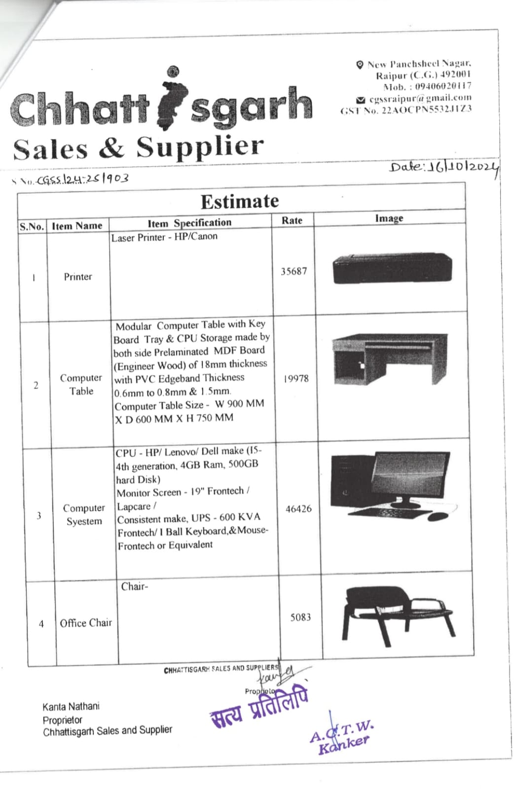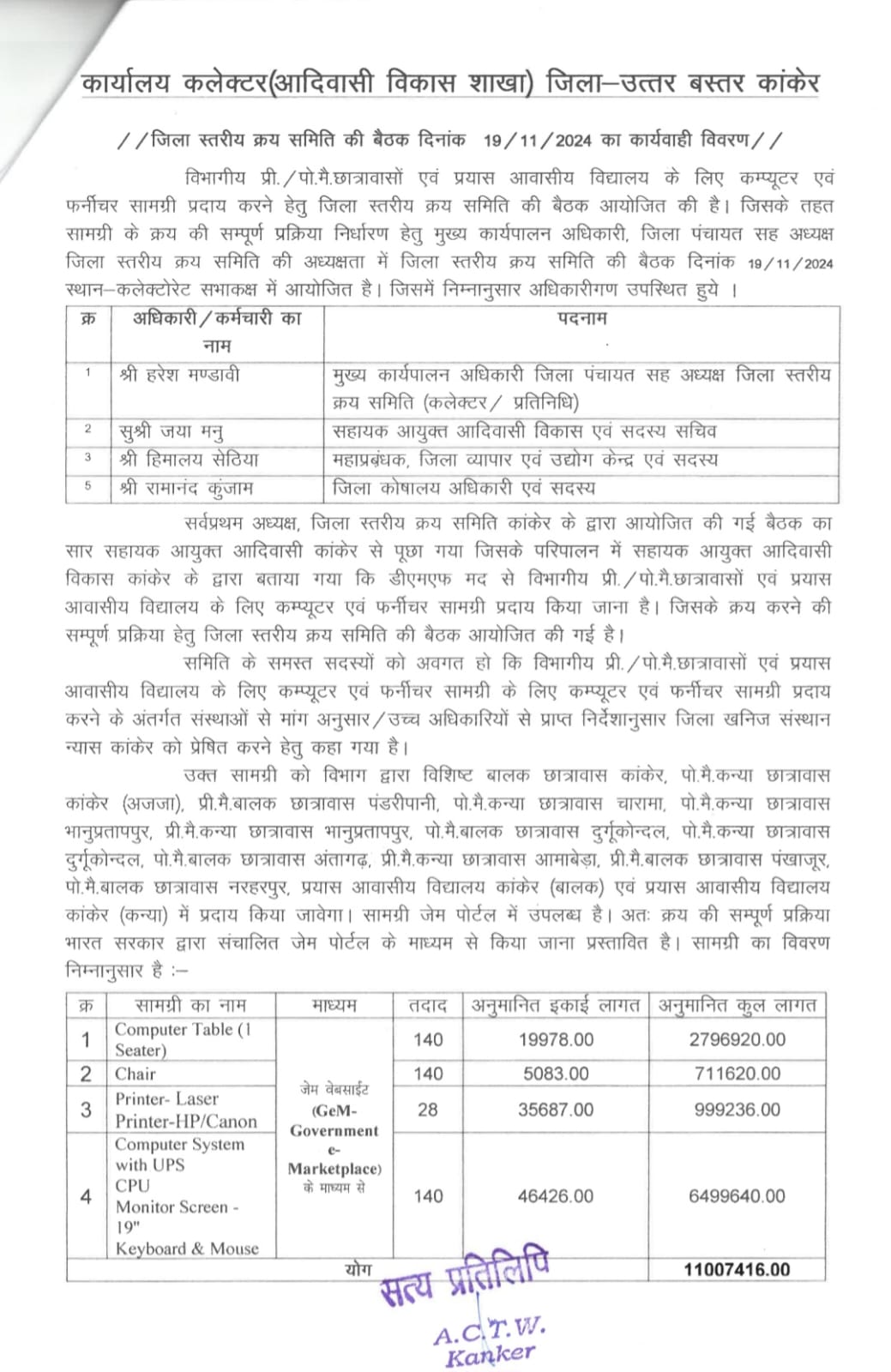 यहाँ बताना होगा कि कार्यालय कलेक्टर जिला खनिज संस्थान न्यास कांकेर द्वारा कार्यालय सहायक आयुक्त आदिवासी विकास कांकेर को वित्तीय वर्ष 2024 -25 में 140 विभागीय प्री./पो.मै. छात्रावासों एवं प्रयास आवासीय विद्यालय के लिए कम्प्यूटर एवं फर्नीचर सामाग्री प्रदाय करने 1 करोड़ 10 लाख 7 हजार 416 रुपए की प्रशासकीय स्वीकृति दी गई थी। जिसमें विभाग ने 140 विभागीय प्री./पो.मै. छात्रावासों एवं प्रयास आवासीय विद्यालय के लिए कम्प्यूटर टेबल सीटर ,चेयर ,प्रिंटर -लेजर प्रिंटर -HP/Canon एवं कम्प्यूटर सिस्टम विद यूपीएस सीपीयू-मॉनिटर स्क्रीन 19 की-बोर्ड एंड मॉउस की खरीदी की जानी थी। उक्त सामाग्री जिला स्तरीय क्रय समिति के माध्यम से की गई है।उक्त बजट में क्रय किए गए सामाग्रियों के दर ,गुणवत्ता ,क्रय प्रक्रिया में अनियमितता को लेकर विश्वसनीय सूत्रों से जानकारी मिल रही थी। जिसे देखते हुए सूचना के अधिकार के तहत क्रय प्रक्रिया,कार्यादेश ,आदि जानकारी चाही गई थी। विभाग द्वारा सूचना के अधिकार के तहत प्रदत्त जानकारी में डीएमएफ की राशि का बंदरबाट किया जाना स्वतः प्रदर्शित हो रहा। जिला स्तरीय क्रय समिति की 19 नवंबर 2024 को जारी कार्यवाही विवरण में 140 विभागीय प्री./पो.मै. छात्रावासों एवं प्रयास आवासीय विद्यालय के लिए क्रय किए गए कम्यूटर टेबल (1 सीटर )की अनुमानित लागत 19 हजार 978 रुपए की दर से कुल 140 नग जेम पोर्टल व ई मार्केट प्लेस के माध्यम से क्रय करने कुल 27 लाख 96 हजार 920 रुपए प्रस्तावित किया गया था। विभाग द्वारा प्रदत्त कोटेशन की सत्यप्रतिलिपि के अवलोकन से उक्त सामाग्री फर्म छत्तीसगढ़ सेल्स एंड सप्लायर रायपुर से क्रय की गई है।