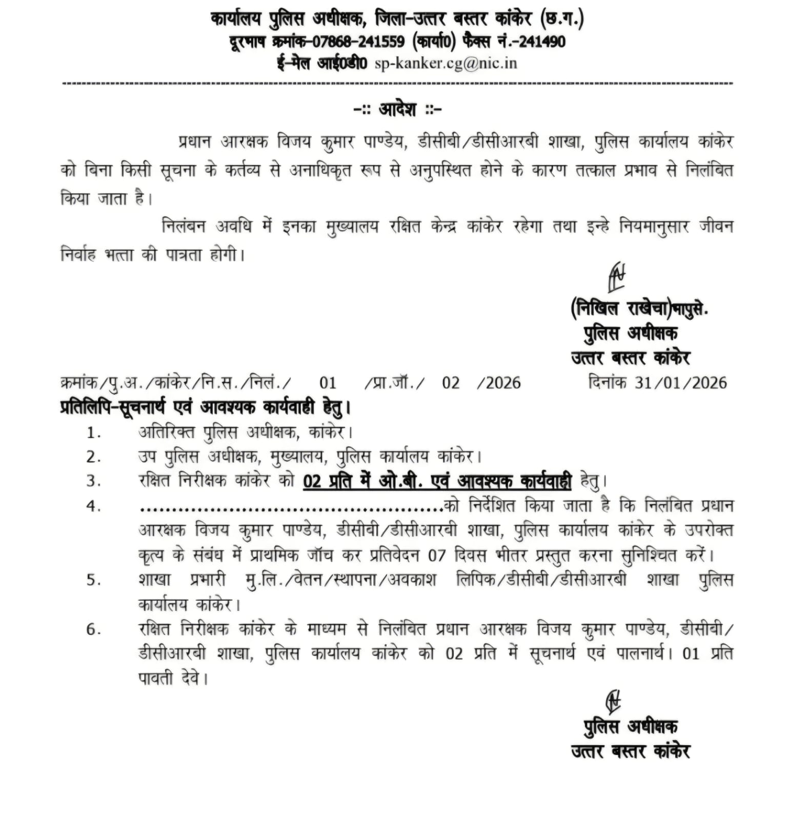 पुलिस अधीक्षक, उत्तर बस्तर कांकेर द्वारा जारी निलंबन आदेश में उल्लेख है कि, प्रधान आरक्षक विजय कुमार पाण्डेय को बिना किसी सूचना के कर्तव्य से अनाधिकृत रूप से अनुपस्थित रहने के कारण तत्काल प्रभाव से निलंबित किया जाता है। निलंबन अवधि में उनका मुख्यालय रक्षित केंद्र, कांकेर निर्धारित किया गया है और वे नियमानुसार जीवन निर्वाह भत्ता पाने के पात्र होंगे। इसके साथ ही एसपी ने आदेश में यह भी निर्देश दिए हैं कि इस पूरे मामले की प्राथमिक जांच कर 7 दिवस के भीतर प्रतिवेदन प्रस्तुत किया जाए। मामले को लेकर पुलिस महकमे में हड़कंप है और आगे की जांच में और भी खुलासों की संभावना जताई जा रही है।