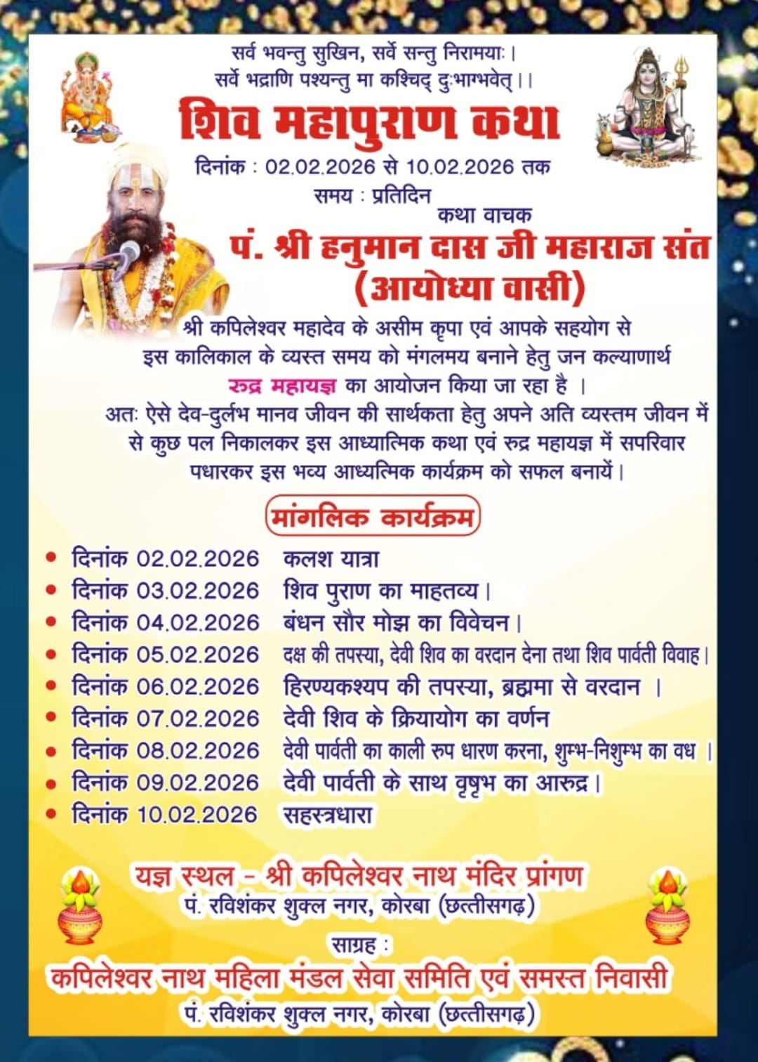 कोरबा। कोरबा पं. रविशंकर शुक्ल नगर, कोरबा स्थित श्री कपिलेश्वर नाथ मंदिर प्रांगण में जनकल्याणार्थ रुद्र महायज्ञ एवं शिव महापुराण कथा का भव्य आयोजन किया जा रहा है।