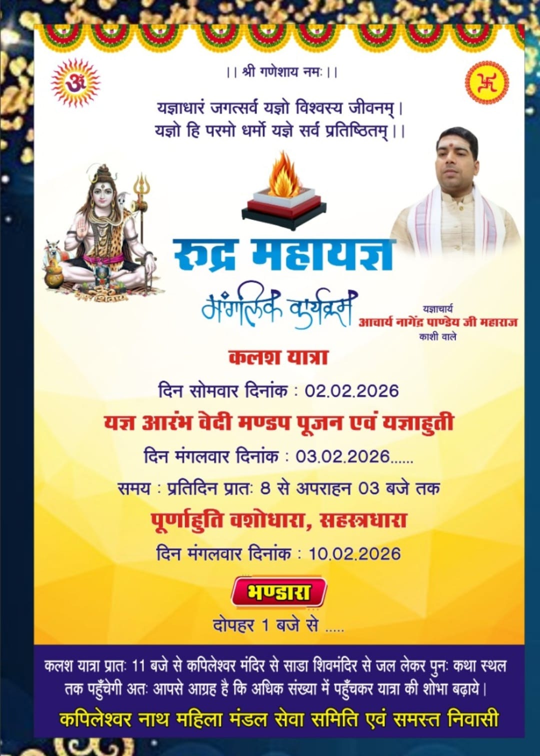 यह धार्मिक आयोजन 02 फरवरी 2026 से 10 फरवरी 2026 तक प्रतिदिन प्रातः 8 बजे से दोपहर 3 बजे रुद्र महायज्ञ होगा तथा संध्या 4:00 से 8:00 तक शिव महापुराण की कथा होगी ।