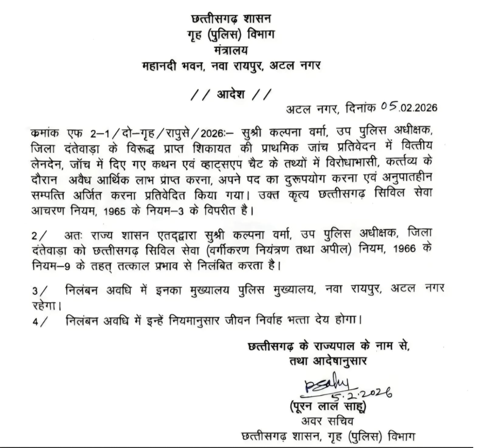 रायपुर। सरकार ने दंतेवाड़ा में पदस्थ रहीं डीएसपी कल्पना वर्मा को निलंबित कर दिया है। उनके खिलाफ लगाए गए गंभीर आरोपों की जांच रिपोर्ट में पुष्टि होने के बाद यह कार्रवाई की गई है।