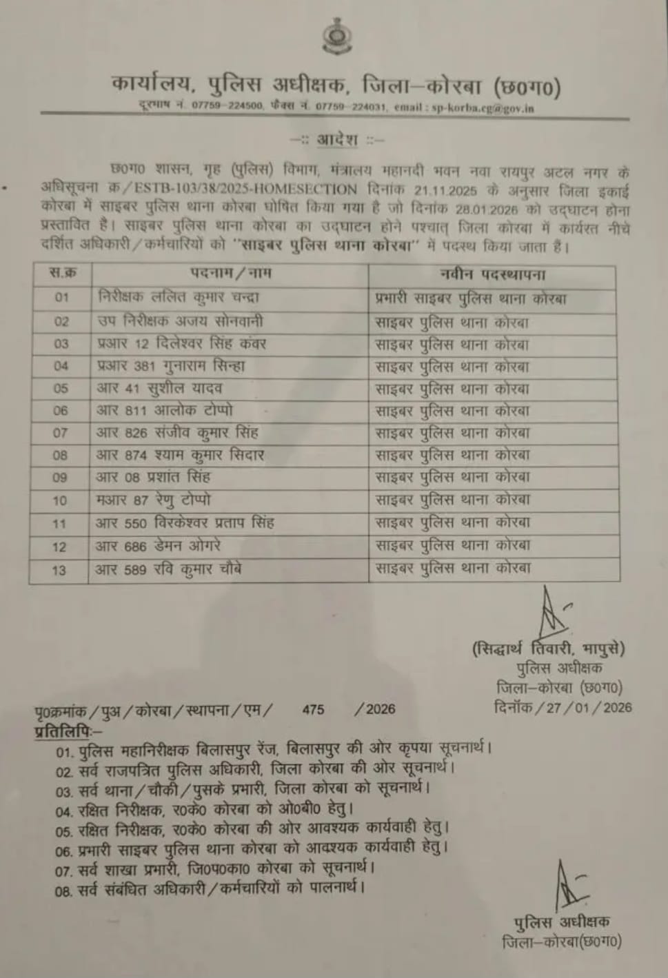 कोरबा। जिले के साइबर थाने में एक बार फिर बड़ा प्रशासनिक बदलाव हुआ है। SP सिद्धार्थ तिवारी के आदेश पर साइबर थाना प्रभारी एसआई अजय सोनवानी को हटा दिया गया है। उनकी जगह अब टीआई ललित चंद्रा को साइबर थाना प्रभारी की जिम्मेदारी सौंपी गई है।