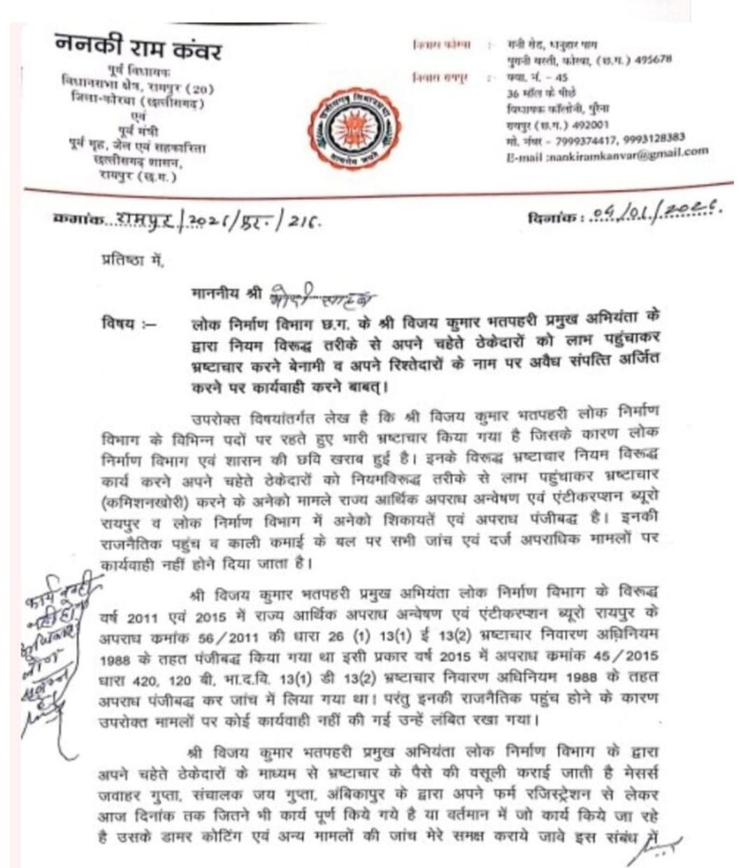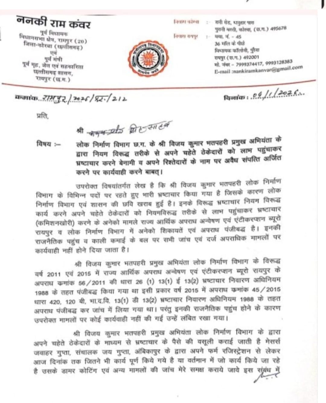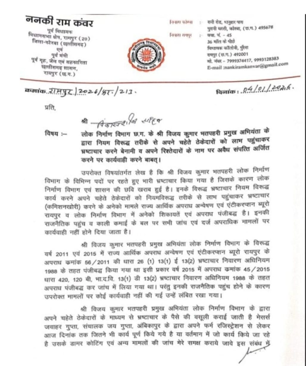 वरिष्ठ भाजपा नेता और पूर्व गृह मंत्री ननकी राम कंवर ने लोक निर्माण विभाग के प्रमुख अभियंता विजय कुमार भतपहरी पर गंभीर भ्रष्टाचार के आरोप लगाते हुए मुख्य सचिव विकासशील सहित वरिष्ठ नेताओं को पत्र भेजा है। उन्होंने भतपहरी के खिलाफ सीबीआई जांच की मांग की है। यह घटनाक्रम छत्तीसगढ़ सहित शहर के सियासी गलियारों में चर्चा का विषय बन गया है।