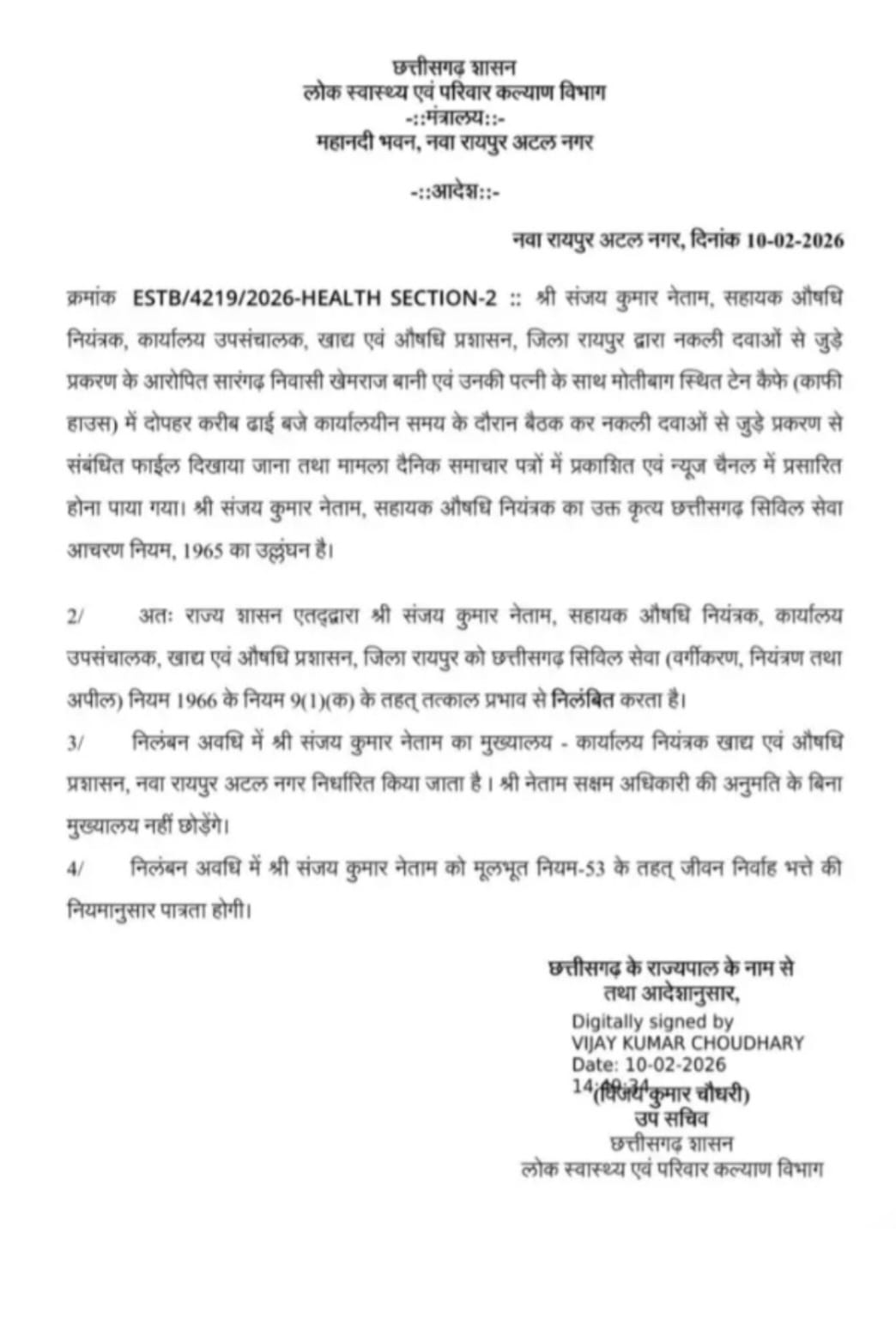 रायपुर। छत्तीसगढ़ शासन के लोक स्वास्थ्य एवं परिवार कल्याण विभाग ने बड़ी कार्रवाई करते हुए सहायक औषधि नियंत्रक (Assistant Drug Controller) संजय कुमार नेताम को तत्काल प्रभाव से निलंबित कर दिया है।