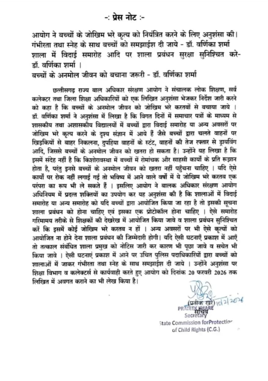 बता दें कि, विगत कुछ दिनों से स्कूलों में फेयरवेल पार्टियों के दौरान विद्यार्थियों के अस्वाभाविक और अनुशासनहीन आचरण देखने को मिल रहे हैं, जिसके कारण छत्तीसगढ़ राज्य बाल संरक्षण आयोग और शिक्षा विभाग हरकत में आ गए हैं। इन घटनाओं ने न केवल स्कूल प्रशासन, बल्कि अभिभावकों और समाज को भी चिंता में डाल दिया है। विद्यार्थियों के इस आचरण को देखते हुए, आयोग ने अब स्कूलों में आयोजित होने वाले कार्यक्रमों के लिए स्पष्ट दिशा-निर्देश जारी करने की अनुशंसा की है।