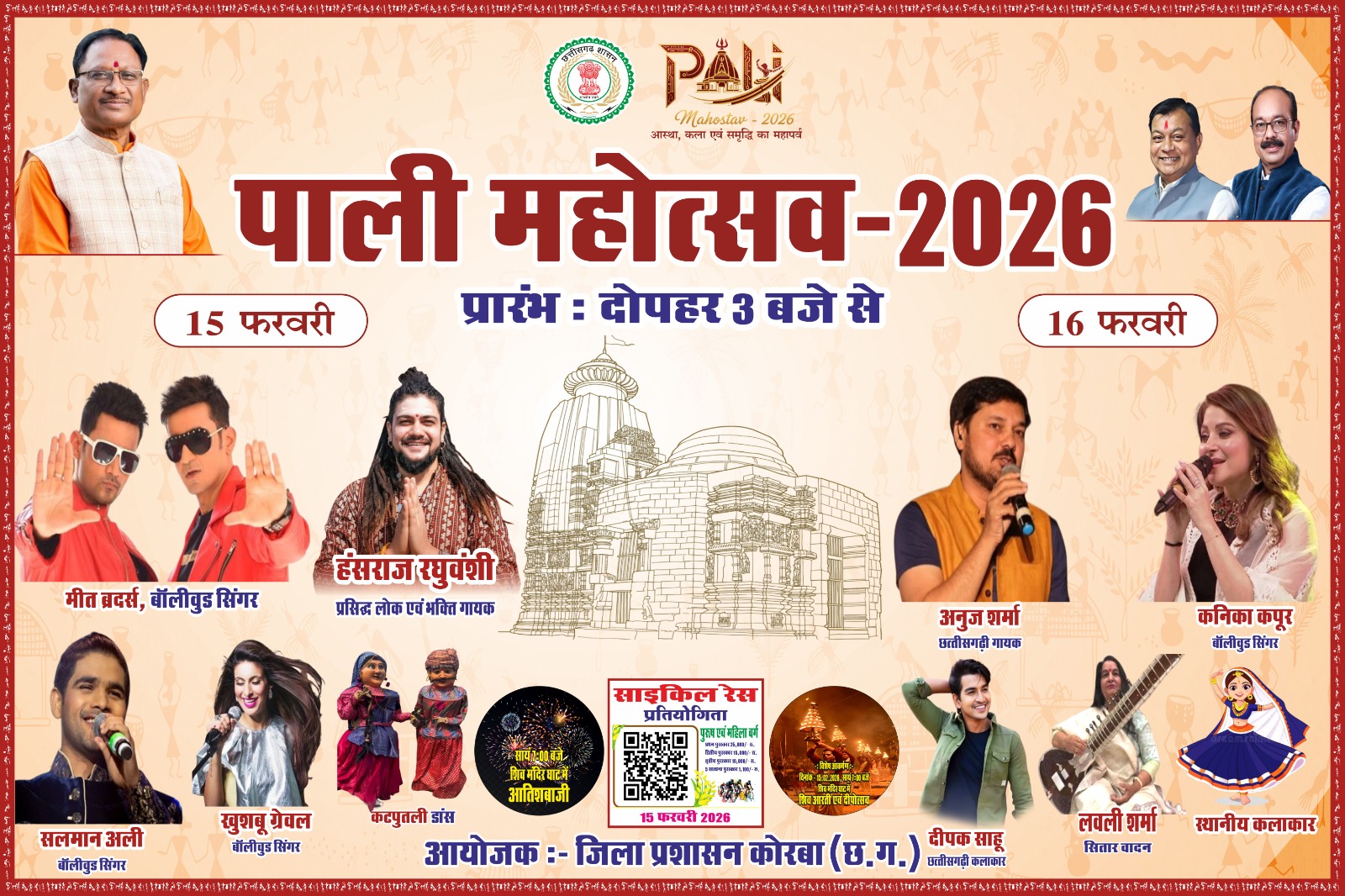 15 फरवरी को शाम 7 बजे उप मुख्यमंत्री (लोक निर्माण,लोक स्वास्थ्य यांत्रिकी ,नगरीय प्रशासन एवं विकास ,खेल एवं युवा कल्याण मंत्री )अरुण साव के मुख्य आतिथ्य में पाली महोत्सव का
