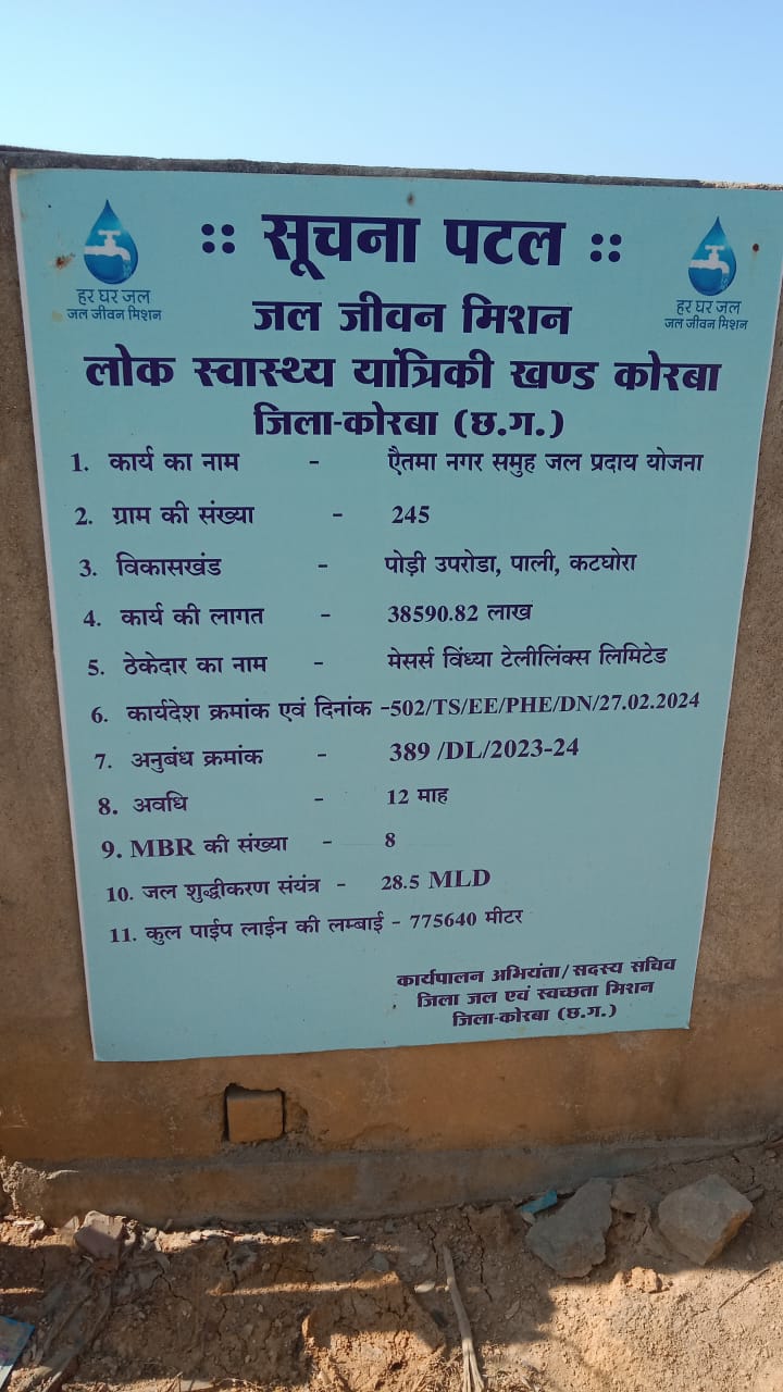 यहाँ बताना होगा कि देश के हर परिवार को शुद्ध पेयजल की आपूर्ति सुनिश्चित करने की सोंच के साथ प्रधानमंत्री नरेंद्र मोदी जी की मंशानुरूप केंद्र शासन का जल शक्ति मंत्रालय ने राज्यों के समन्वय से हर घर नल हर घर जल के नारों के साथ जल जीवन मिशन की शुरुआत की है। जिसके तहत 20 घर से अधिक की आबादी वाले प्रत्येक गांवों के प्रत्येक घरों में पाइपलाइन रेफ्रोफिटिंग के माध्यम से शुद्ध जल की निर्बाध आपूर्ति सुनिश्चित की जानी है। लेकिन बेहतर कार्ययोजना के अभाव ,तकनीकी पेचीदगियों ,आदि की पेंच में योजना की मियाद मार्च 2028 तक आगे बढ़ गई है। लेकिन छत्तीसगढ़ में पिछले 7 माह से योजना की रफ्तार वित्तीय संकट की वजह से थम सी गई है। बात करें आकांक्षी जिला कोरबा की तो यहां कुल 703 गांवों में 1095 योजना स्वीकृत है। जिसमें से 458 गांवों में एकल ग्राम योजना ( सिंगल विलेज स्कीम ) तो शेष कटघोरा,पाली ,पोंडीउपरोड़ा के 245 गांव एतमानगर समूह जल प्रदाय योजना (मल्टी विलेज स्कीम )में शामिल किए गए हैं। पीएचई विभाग जल जीवन मिशन के अंतर्गत इन दोनों योजनाओं के लिए (सिंगल विलेज स्कीम में तकरीबन 400 करोड़ रुपए एवं मल्टी विलेज स्कीम में 116 करोड़ रुपए ) तकरीबन 51