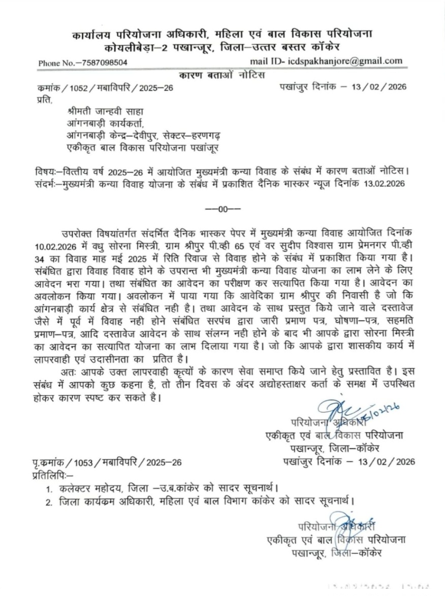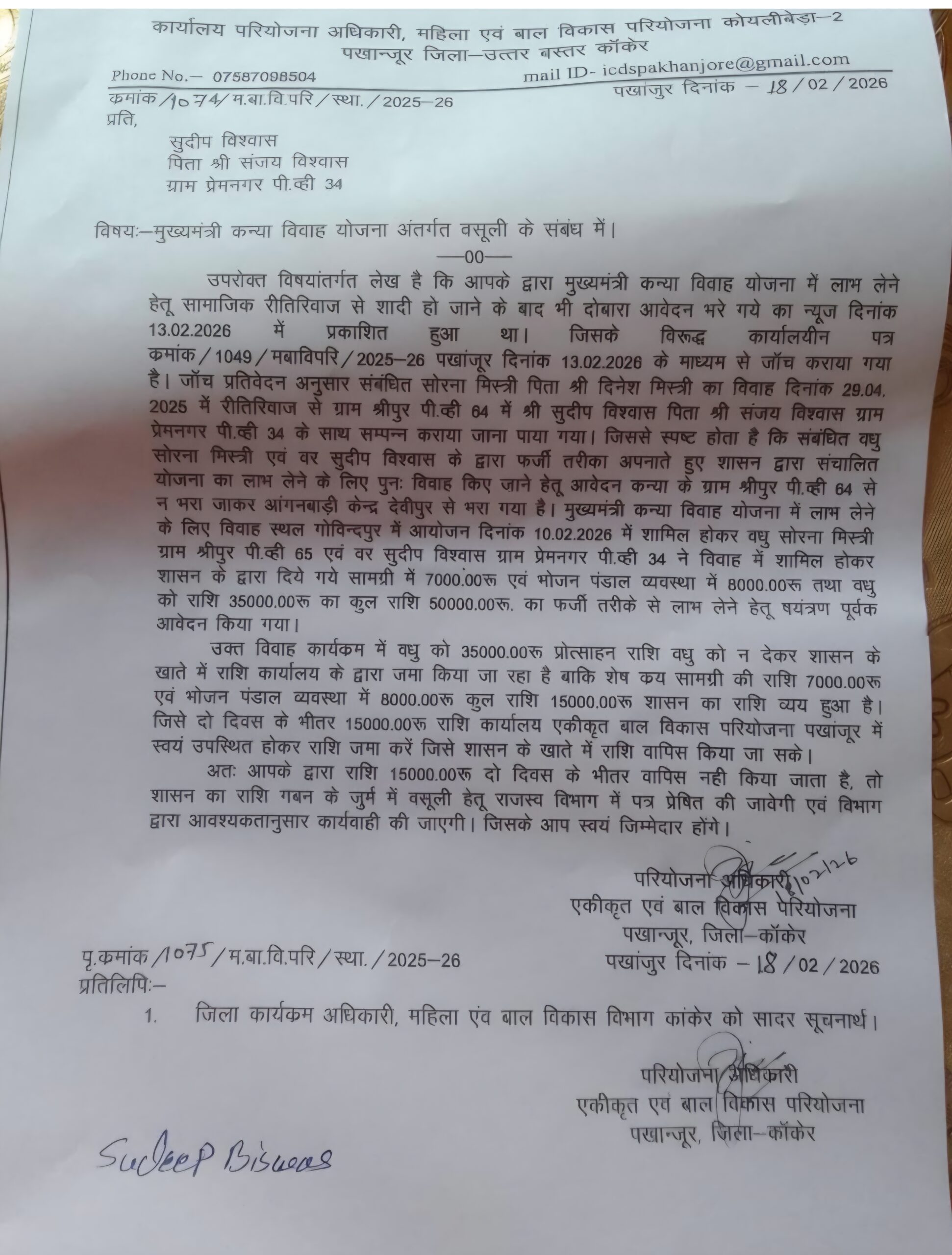 मामले में महिला एवं बाल विकास विभाग ने नोटिस जारी कर राशि वसूली के निर्देश दिए हैं. महिला एवं बाल विकास परियोजना, कोयलीबेड़ा-2 पखांजूर द्वारा जारी पत्र के अनुसार, जांच में पाया गया कि संबंधित जोड़े ने योजना का लाभ लेने के लिए दोबारा विवाह किया. 35 हजार रुपए की प्रोत्साहन राशि में से 15 हजार रुपए की राशि तत्काल वापस जमा करने के निर्देश दिए गए हैं. दो दिन में राशि जमा नहीं करने पर संबंधित हितग्राही के खिलाफ गबन की धाराओं में एफआईआर दर्ज कर कानूनी कार्रवाई की जाएगी. वहीं संबंधित आंगनबाड़ी कार्यकर्ता को भी कारण बताओ नोटिस जारी किया गया है.