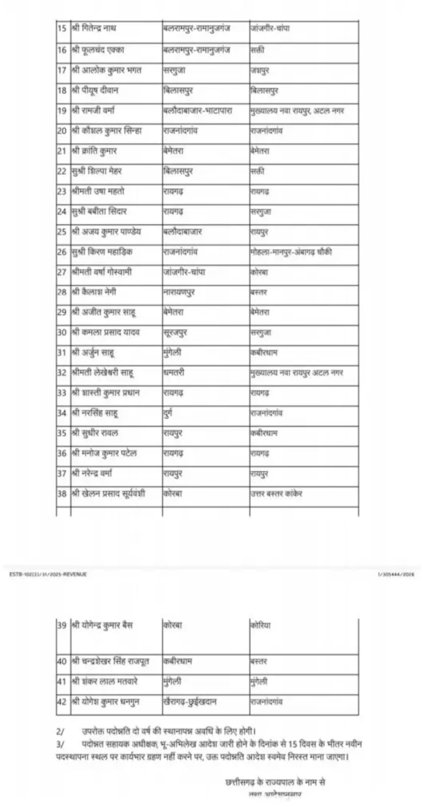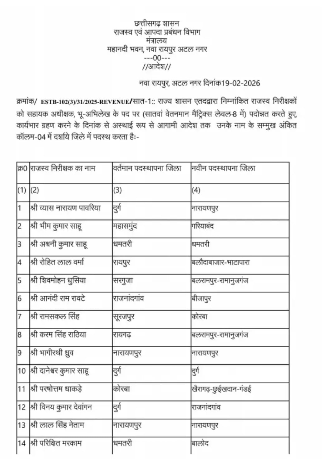 जारी आदेशानुसार कोरबा जिले में पदस्थ राजस्व निरीक्षक पुरषोत्तम धाकड़े को खैरागढ़-छुईखदान-गंडई , खेलन सूर्यवंशी को उत्तर -बस्तर -कांकेर एवं योगेंद्र कुमार बैस को कोरिया जिला में पदस्थापना दी गई है। गौरतलब हो कि सहायक अधीक्षक भू अभिलेख का पद नायब तहसीलदार के समतुल्य पद है। लिहाजा राजस्व निरीक्षकों के लिए होली पर्व से पूर्व इस पद पर पदस्थापना हर्ष का विषय है। इससे पहले लंबे समय से पदोन्नति की चर्चा चल रही थी, जिस पर अब मुहर लग गई है।इनकी पदस्थापना से सम्बंधित जिलों के राजस्व कार्यों में गति आएगी। पखवाड़े भर के भीतर नवीन पदस्थापना स्थल में कार्यभार ग्रहण नहीं करने पर उक्त पदोन्नति आदेश स्वमेव निरस्त हो जाएँगे। लिहाजा पदोन्नति का लाभ लेने वाले आरआई को नवीन कार्यस्थल पर इस मियाद के भीतर जॉइनिंग देनी ही होगी।