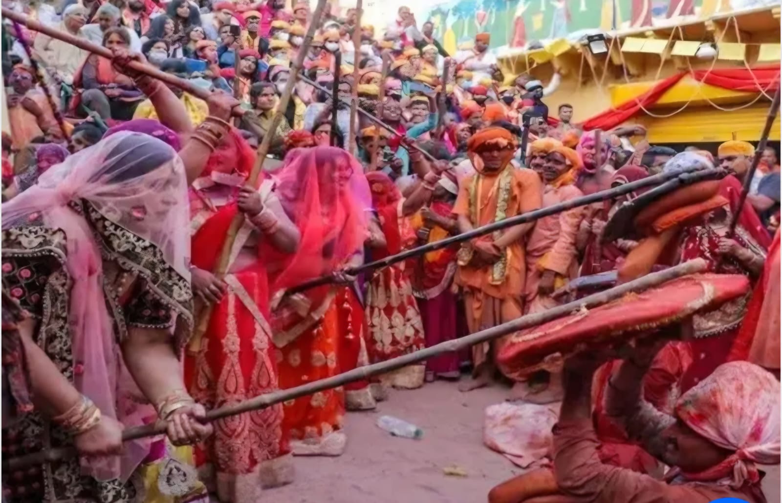 मथुरा। मथुरा के बरसाना में बुधवार को अनोखा नजारा दिखा। चेहरे पर घूंघट, हाथ में लट्ठ और उनके सामने हाथों में ढाल लिए नंदगांव के हुरियारे। इसे देखने के लिए देश-विदेश से 20 लाख लोग मथुरा पहुंचे। नंदगांव से आए श्रीकृष्ण के सखाओं पर बरसाना की राधा बनी सखियों ने जमकर लाठी बरसाईं।