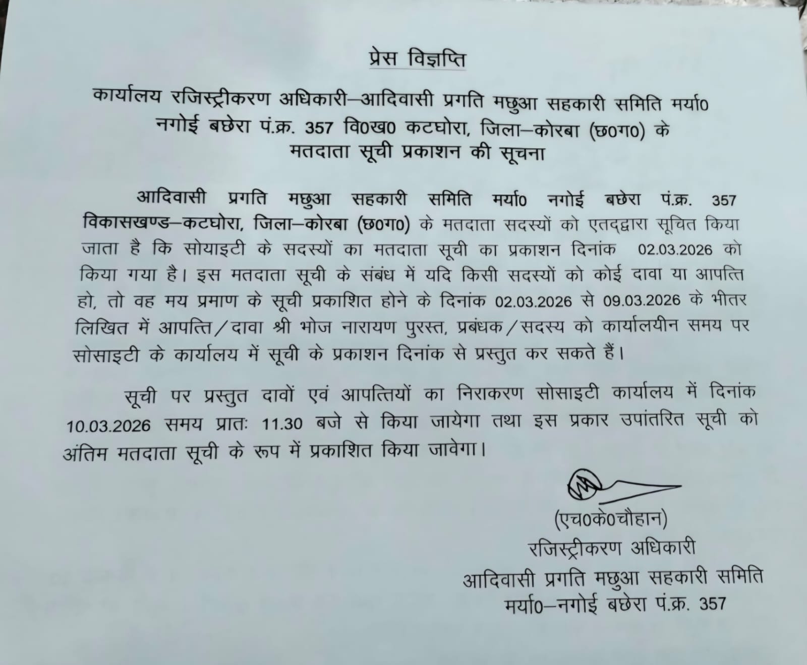कोरबा। आदिवासी प्रगति मछुआ सहकारी समिति मर्या० नगोई बछेरा पं.क्र. 357 विकासखण्ड-कटघोरा, जिला कोरबा (छ०ग०) के मतदाता सदस्यों को एतद्वारा सूचित किया जाता है कि सोयाइटी के सदस्यों का मतदाता सूची का प्रकाशन दिनांक 02.03.2026 को किया गया है।