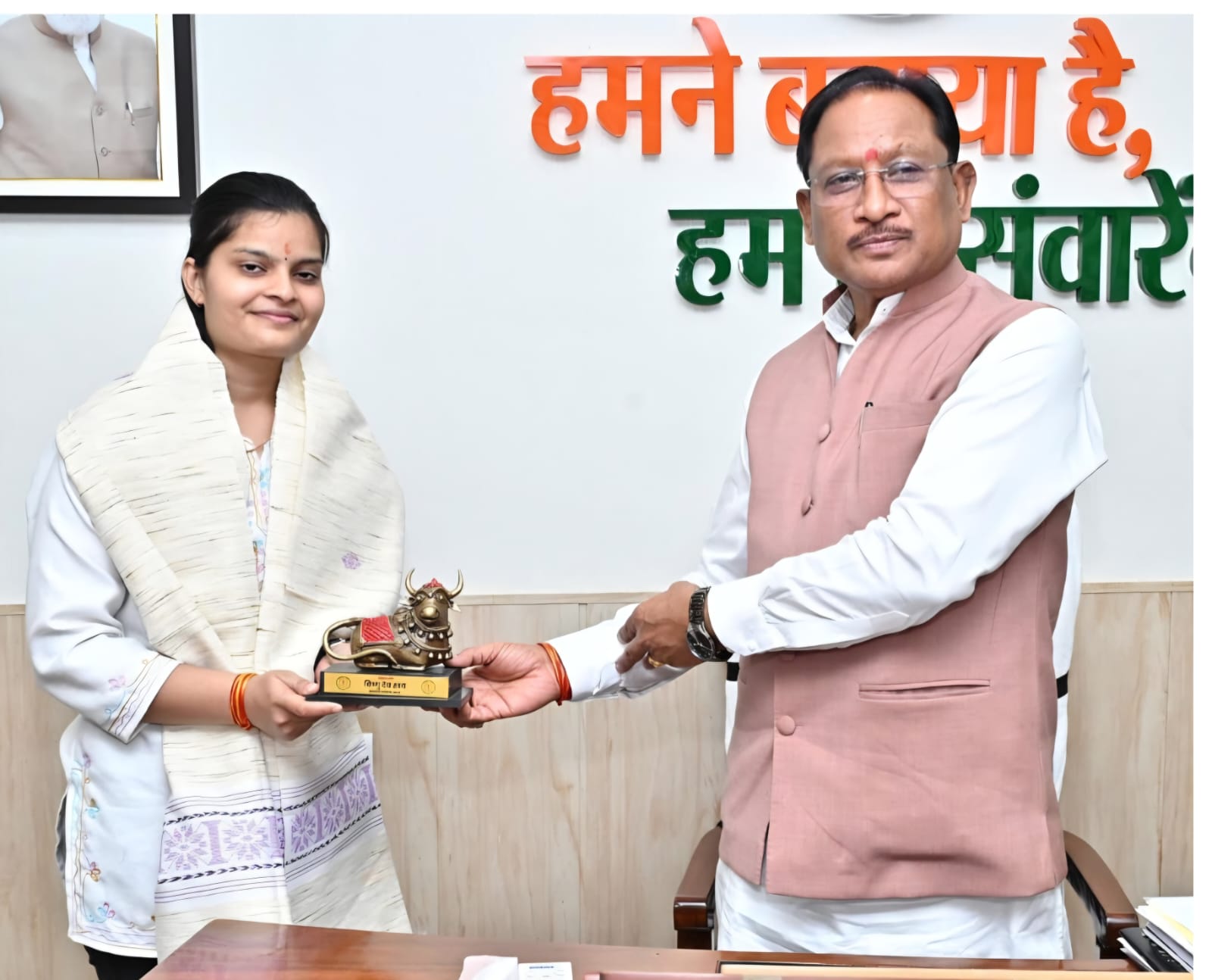 रायपुर । संघ लोक सेवा आयोग की सिविल सेवा परीक्षा में 35वीं रैंक प्राप्त करने वाली सुश्री वैभवी अग्रवाल ने आज मुख्यमंत्री विष्णु देव साय से राजधानी रायपुर स्थित मुख्यमंत्री निवास कार्यालय में भेंट की। मुख्यमंत्री श्री साय ने सुश्री वैभवी को मिठाई खिलाकर उनकी इस उल्लेखनीय उपलब्धि पर हार्दिक बधाई और शुभकामनाएँ दीं।