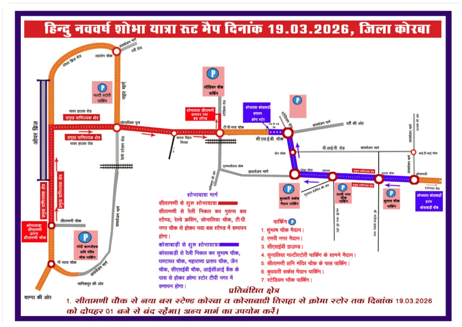 कोरबा से जाने वाले बस,कार, जीप दर्री डेम से बालको से बरबसपुर की ओर जाएंगे। मेन रोड, कोसाबाड़ी से सुभाष चौक, महाराणा प्रताप चौक, सीएसईबी चौक,टीपी नगर चौक, रेलवे क्रॉसिंग, पुराना बस स्टैंड, सीतामणी मार्ग दोपहर 1 बजे से 12 बजे तक प्रतिबंधित रहेंगे व अन्य मार्ग का उपयोग करेंगे। इसी तरह कोसाबाड़ी से क्रोमा स्टोर टीपी नगर मार्ग भी प्रतिबंधित रहेगा।