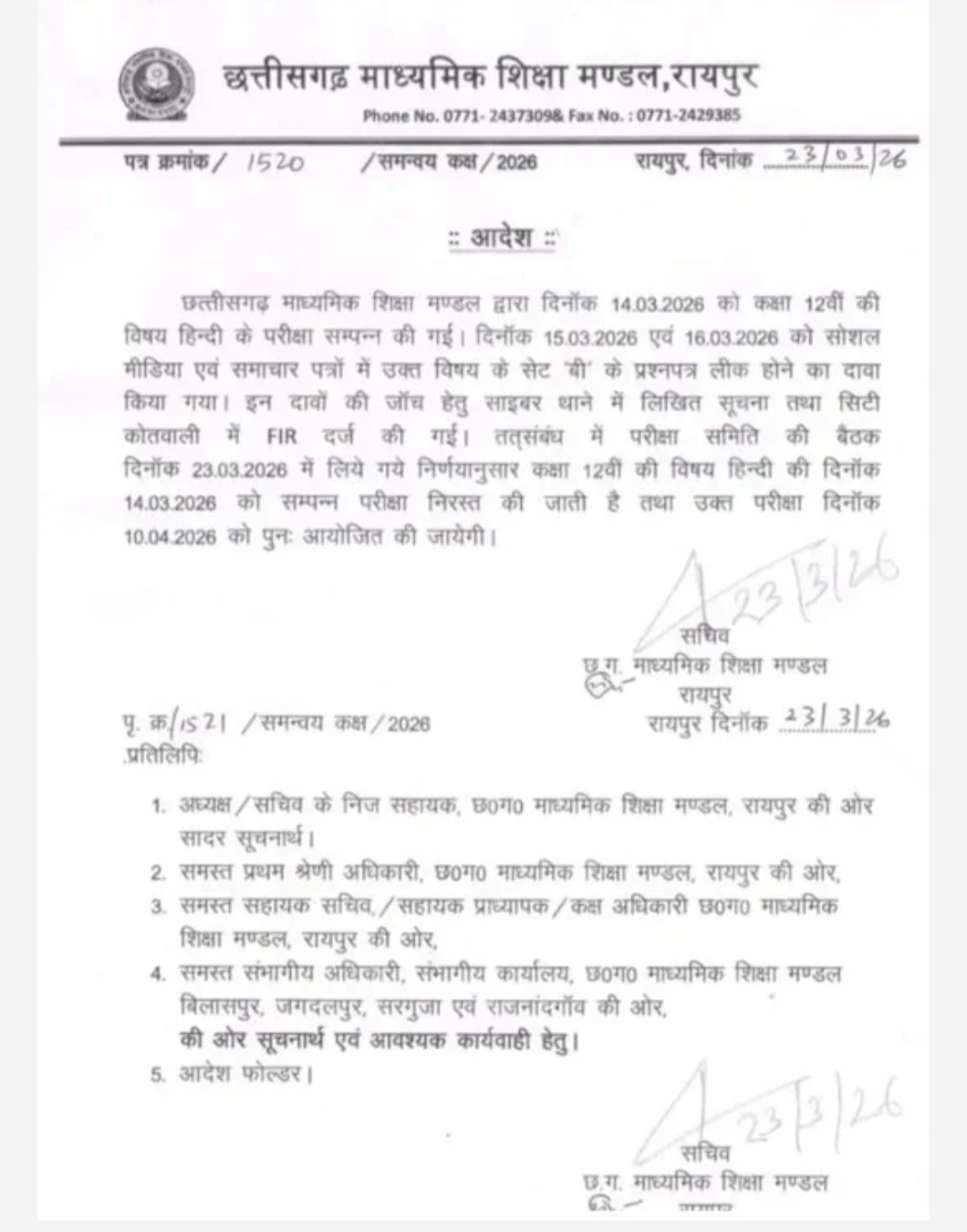 रायपुर । 12वीं बोर्ड परीक्षा की 14 मार्च की परीक्षा निरस्त कर दी गयी है। ये फैसला प्रश्न पत्र के लीक होने के बाद लिया गया है। दरअसल 15 मार्च और 16 मार्च को सोशल मीडिया पर हिंदी विषय के सेट बी के प्रश्न पत्र लीक होने का दावा किया गया था।