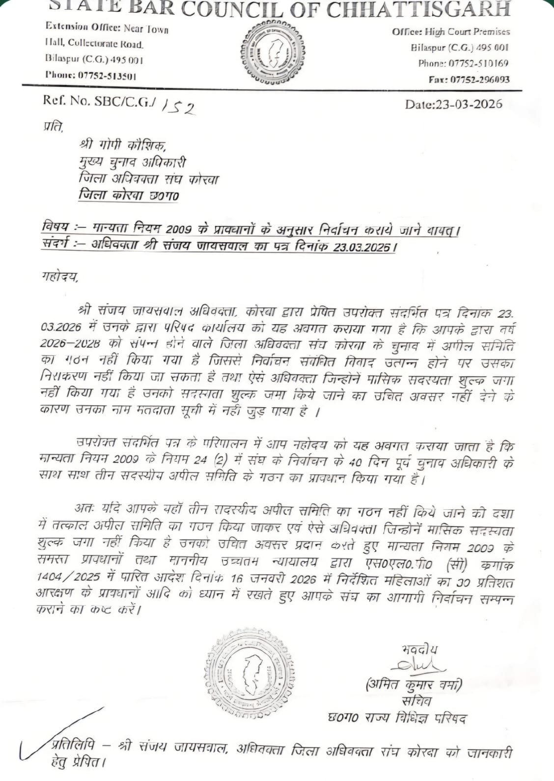 23 मार्च 2026 को जारी पत्र में परिषद ने स्पष्ट किया है कि मान्यता नियम 2009 के तहत चुनाव कराना अनिवार्य है, लेकिन कोरबा में कई अहम प्रक्रियाओं का पालन नहीं किया गया।