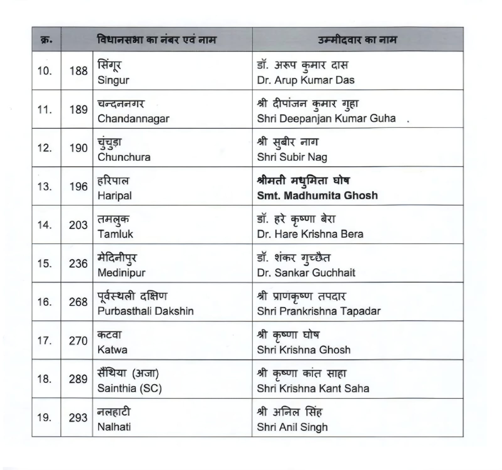 सबसे ज्यादा चर्चा पानीहाटी सीट को लेकर है, जहां पार्टी ने आरजी कर मेडिकल कॉलेज रेप-मर्डर केस की पीड़िता की मां रत्ना देबनाथ को उम्मीदवार बनाया है। इसे भाजपा का बड़ा और भावनात्मक राजनीतिक दांव माना जा रहा है। रत्ना देबनाथ का कहना है कि वह अपनी बेटी को न्याय दिलाने के लिए चुनाव मैदान में उतरी हैं। अन्य प्रमुख उम्मीदवारों में उत्तरपाड़ा से पूर्व एनएसजी अधिकारी दीपांजन चक्रवर्ती, सिंगूर से अरूप कुमार दास और मेदिनीपुर से डॉ. शंकर गुचैत शामिल हैं। सिंगूर सीट पर भाजपा उम्मीदवार की सीधी टक्कर तृणमूल कांग्रेस (TMC) के बेचराम मन्ना से होगी। इसके अलावा कूचबिहार दक्षिण से रथीन्द्रनाथ बोस, रायगंज से दिनेश सरकार, इस्लामपुर से चिरंजीत रॉय, हेमटाबाद से हरिपदा बर्मन, इंग्लिश बाजार से अमलान भादुड़ी, शांतिपुर से स्वप्नन दास, हावड़ा सेंट्रल से बिप्लब मंडल, चंदननगर से दीपांजन कुमार गुहा, चुचुड़ा से सुबीर नाग, हरिपाल से मधुमिता घोष, तमलुक से हरे कृष्णा बेरा और पूर्व मेदिनीपुर दक्षिण से प्राणकृष्ण तपादार को टिकट दिया गया है। कटवा सीट से कृष्णा घोष, सैंथिया से कृष्णकांत साहा और नलहाटी से अनिल सिंह को भी उम्मीदवार बनाया गया है।